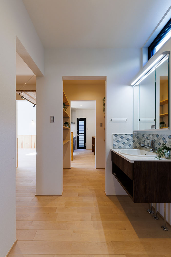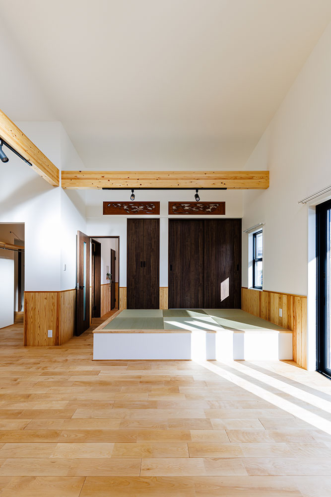 木の香りがする平屋平屋のLDKを勾配天井にして天井の高さと広がりを感じられる開放的なリビングにしました。高窓からやわらかな光が差し込み、時間帯によって表情が変わる明るくて心地いい空間が広がります。玄関からリビングまで続く木の腰壁や大きな梁がお家全体を温かくてナチュラルな優しい雰囲気に。。。小上がりのタタミスペースを設けることでくつろぎと実用性を兼ね備えた暮らしやすい平屋になりました。