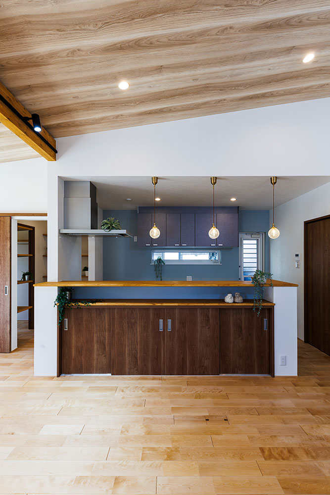 木目の壁紙がアクセントの勾配天井は、広いリビングをさらに、大空間に感じさせてくれます。