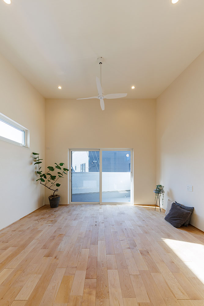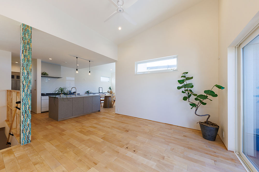 屋根の形状を利用した斜めに昇った天井はリビングをより広く開放的に感じさせてくれます。