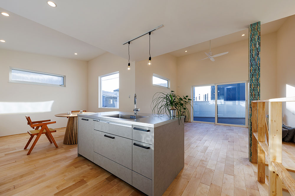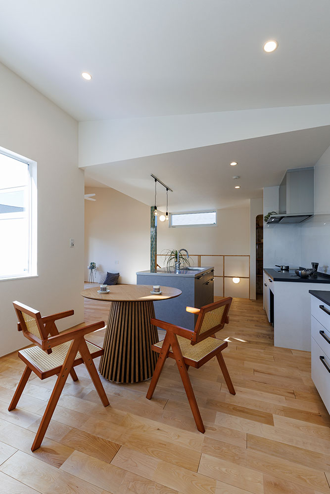 2型のキッチンはふたりで料理するときも余裕のスペースです。ダイニングの一角にスタディスペースを設けいつでも目が届く設計にしました。