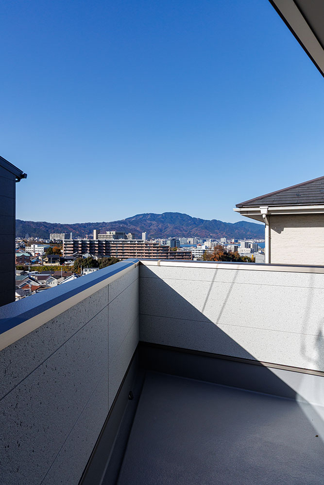 リビングとつながるルーフバルコニーからは、「びわこ」や「比叡山」が望めます。人目を気にせずのんびりできるプライベートな空間を創り出しました。