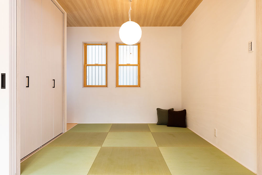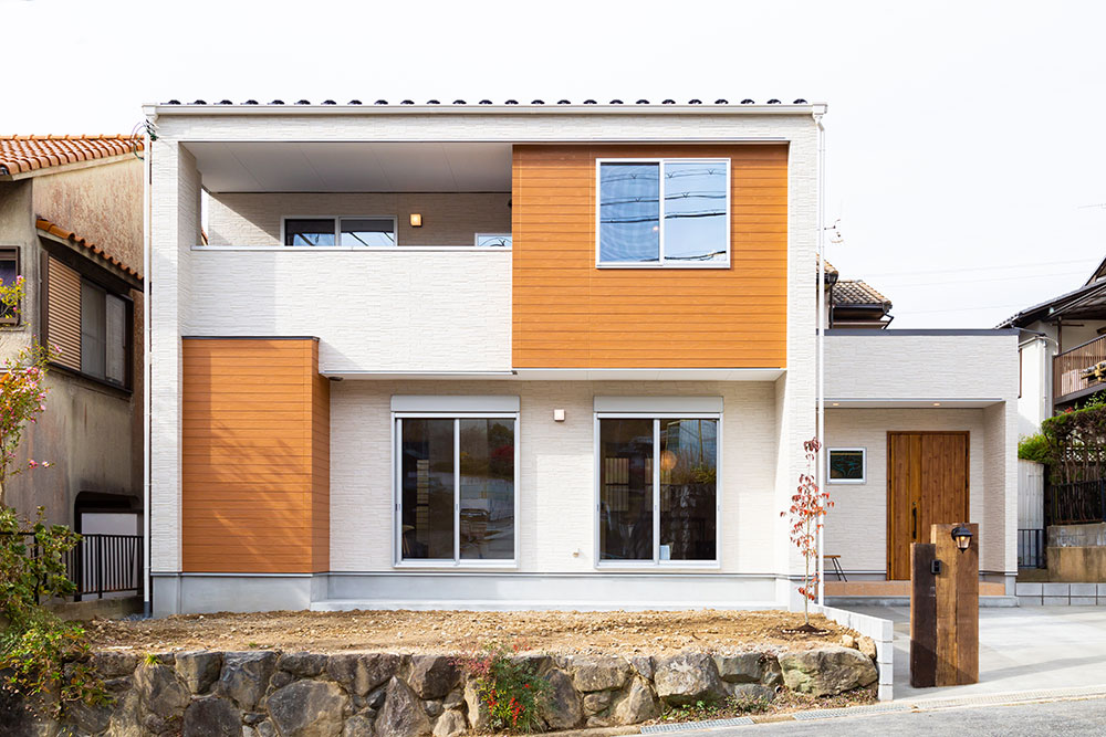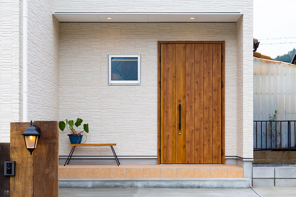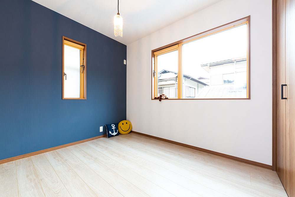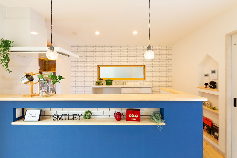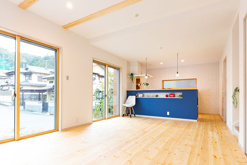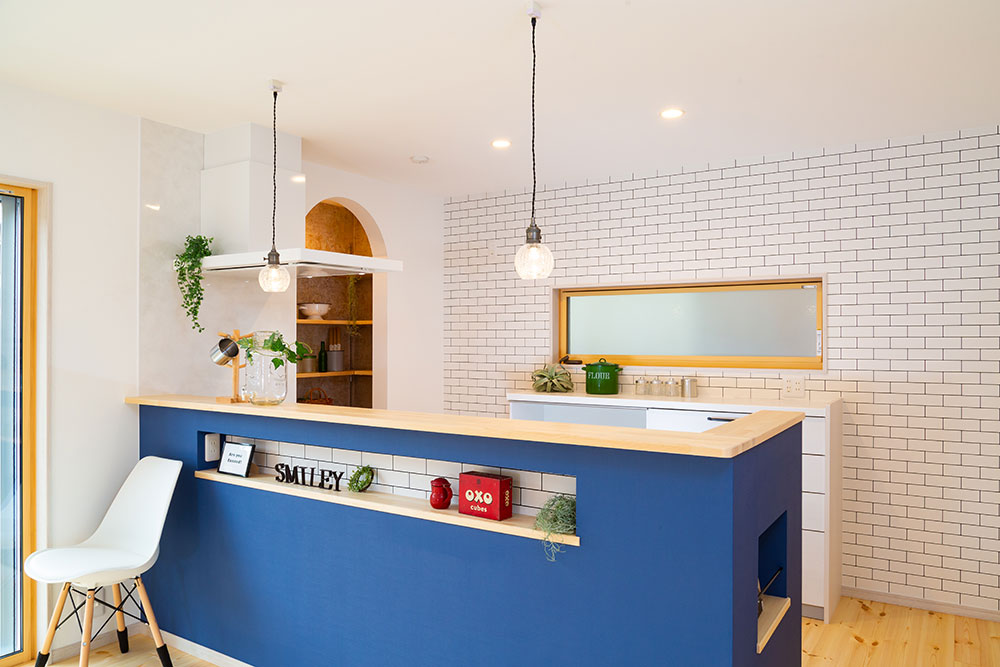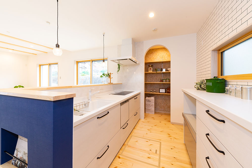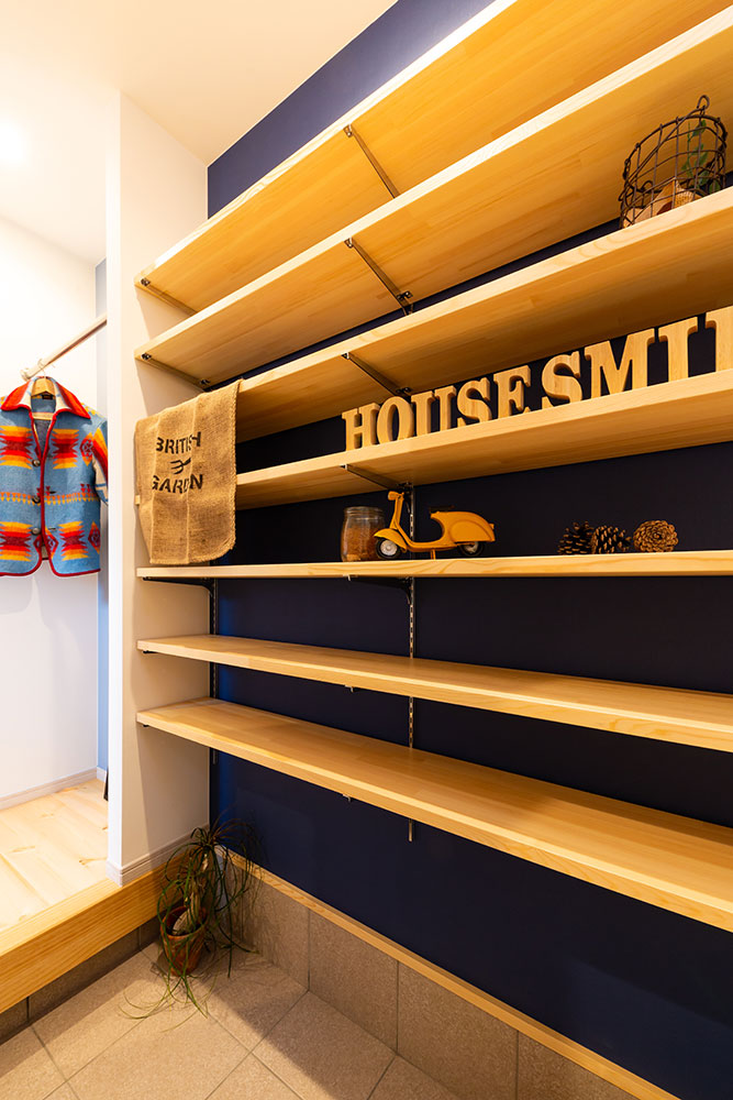 自然素材の優しいお家大きな玄関収納を作ることで玄関はいつもすっきりとします。またコート等の上着も掛けるスペースもとても便利です。アクセントカラーにブルーを使ったとってもかわいいキッチンは奥様のお気に入りの場所です。まるでカフェのようです。キッチンパントリーを設置する事で収納も問題なし、キッチンのすっきりします。サッシの色も床に近いカラーにすることでお部屋全体の統一感が生まれました。
