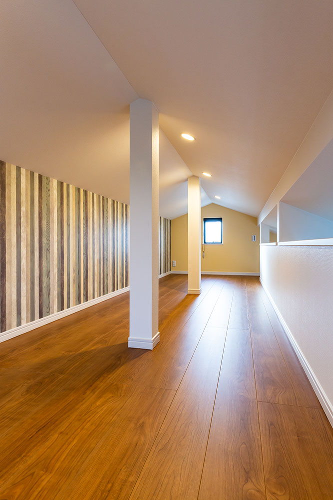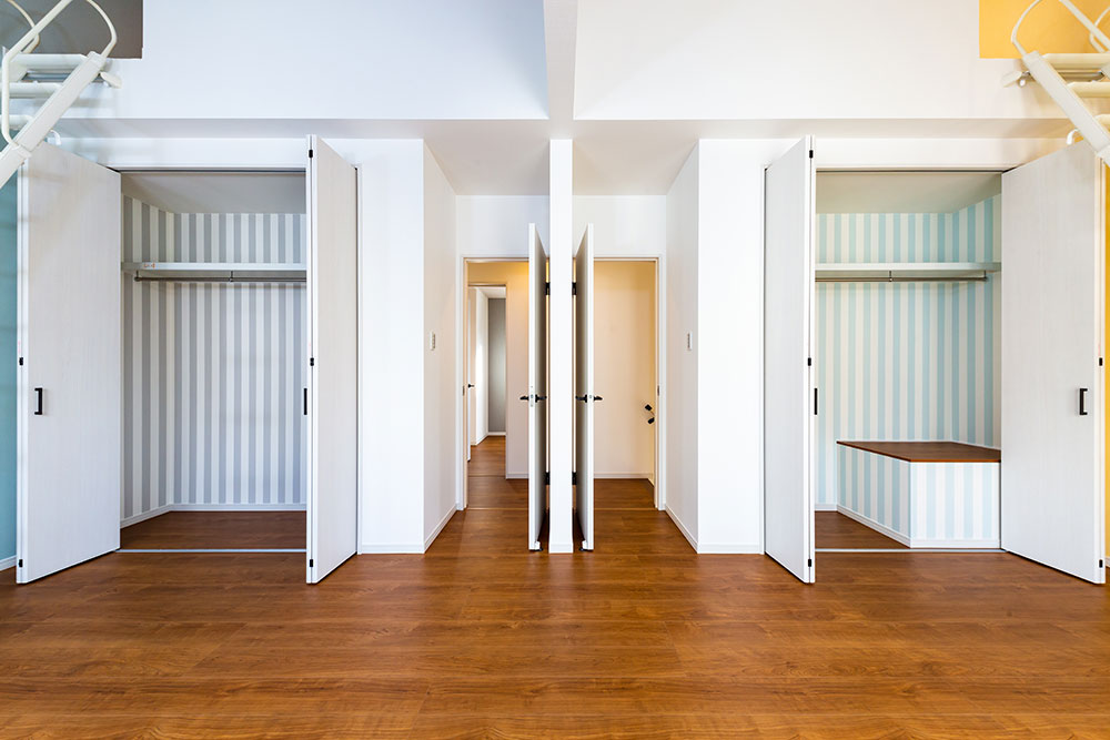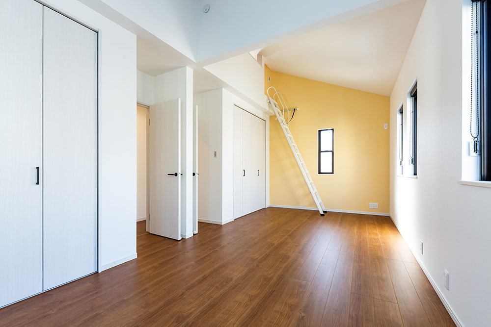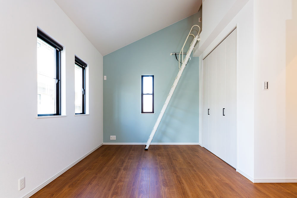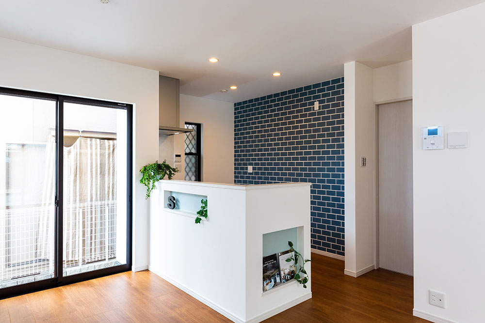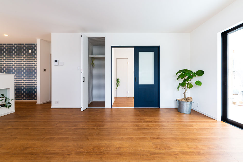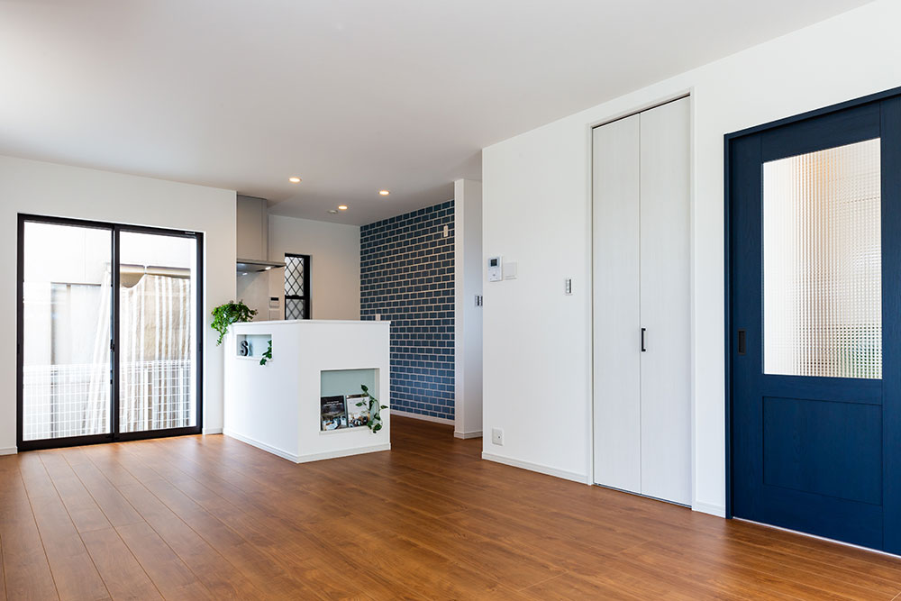 ネイビーのドアがあるお家子供たちが自由な発想を持ちのびのび成長できるお家にしました。子ども部屋はまるで大きな遊び場のように楽しめるロフト付きです。ロフトを設けることにより、お子様が小さな時はあそび場として、大きくなると収納スペースとして利用できるよう設計しています。将来2つの部屋に分けることも想定しています。白で統一されたリビングに映えるネイビーのドアとキッチンの壁がとても素敵です。
