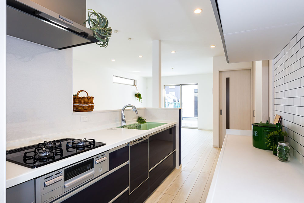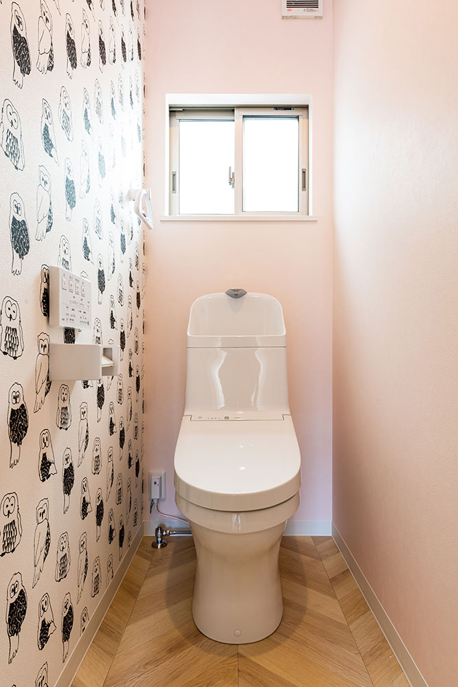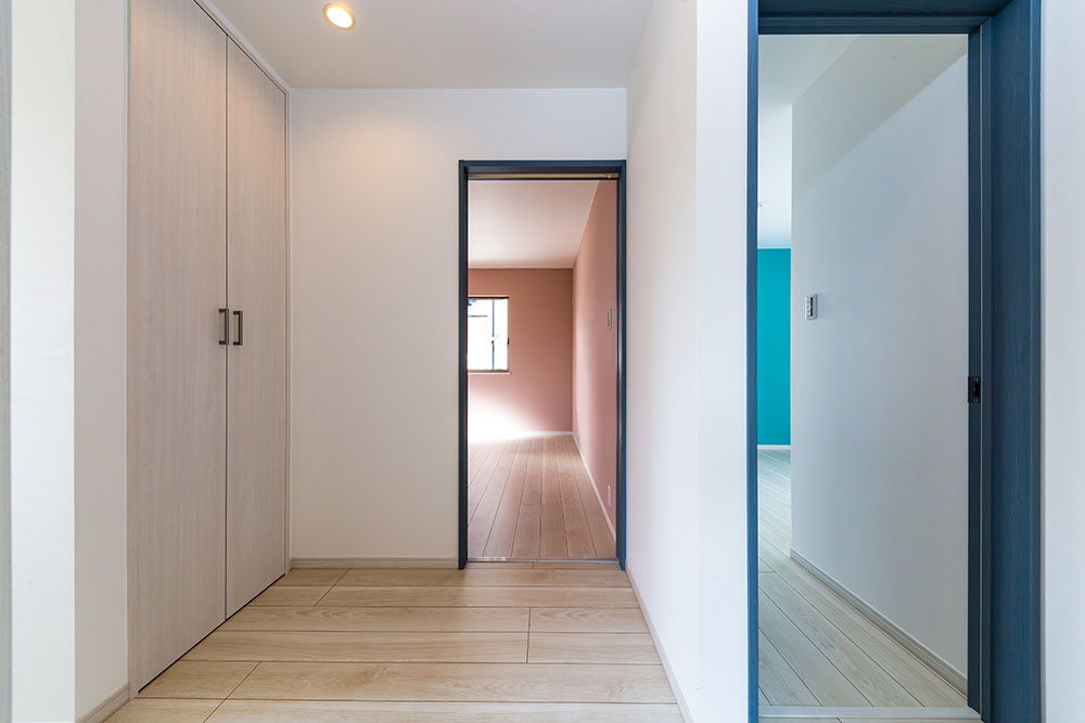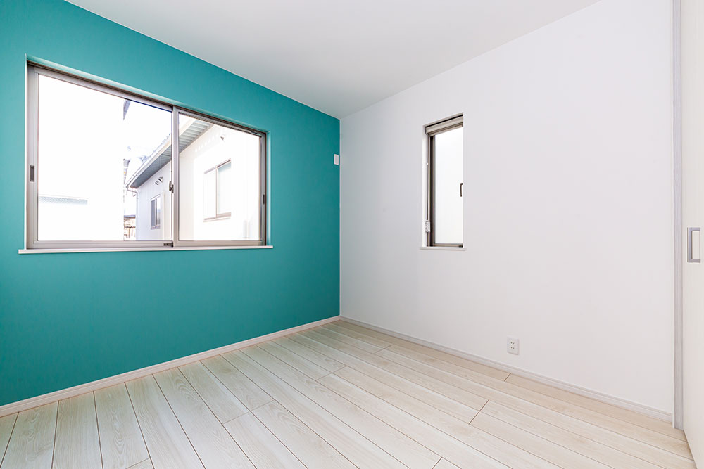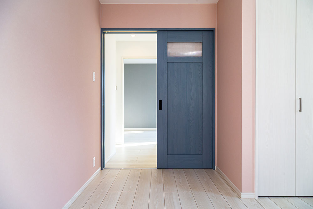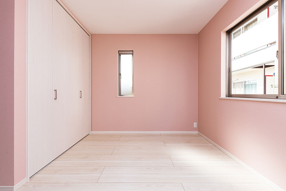 ルーフバルコニーのお家ピンクやグリーン等部屋ごとに異なる壁紙やブルーグレーのドア、グリーンのシンクと細部にまでこだわったとてもキュートなお家です。気分もポップに明るくなります。お天気のいい日は広いルーフバルコニーでのんびりとすることができ、お家時間を楽しむことができます。