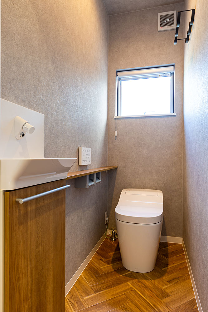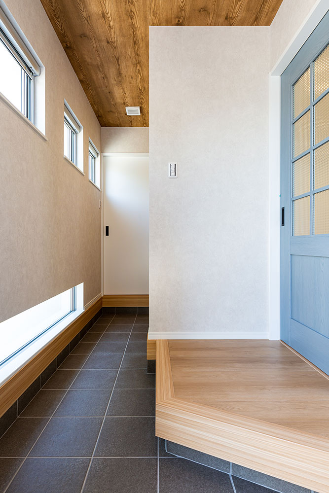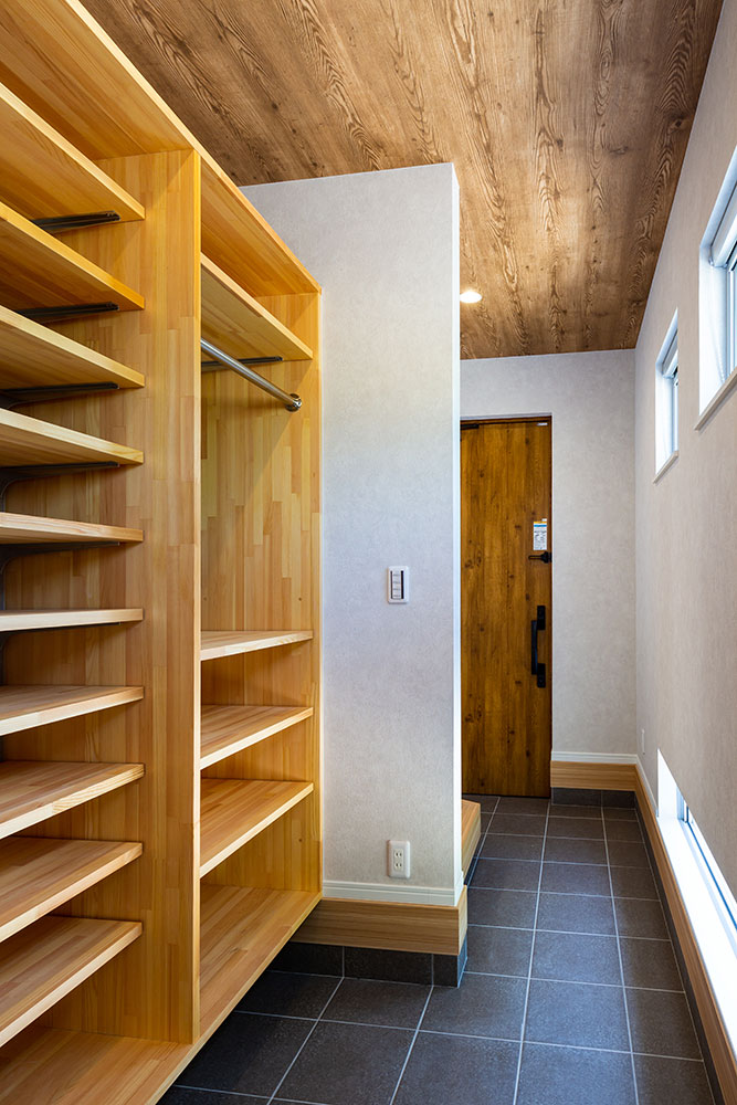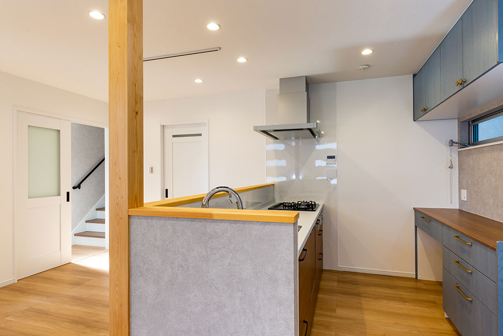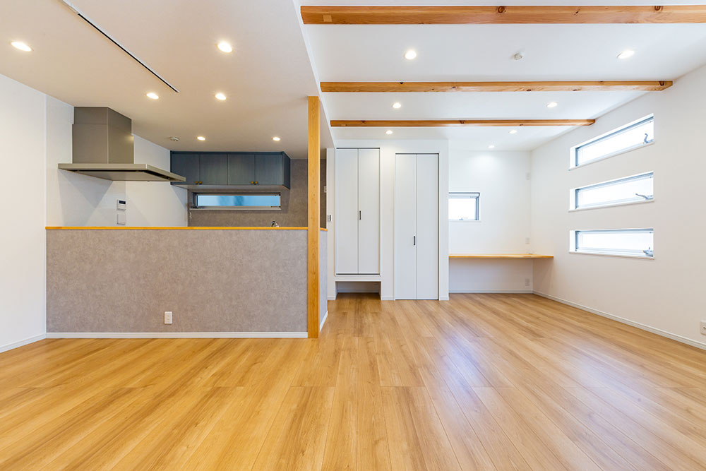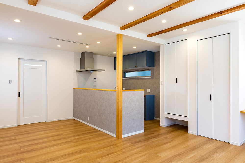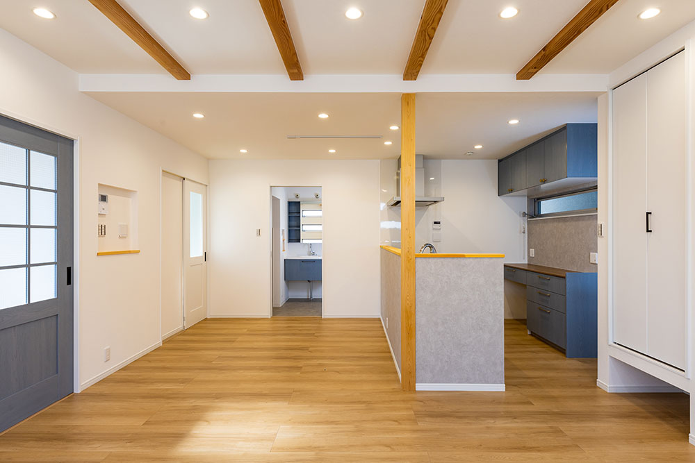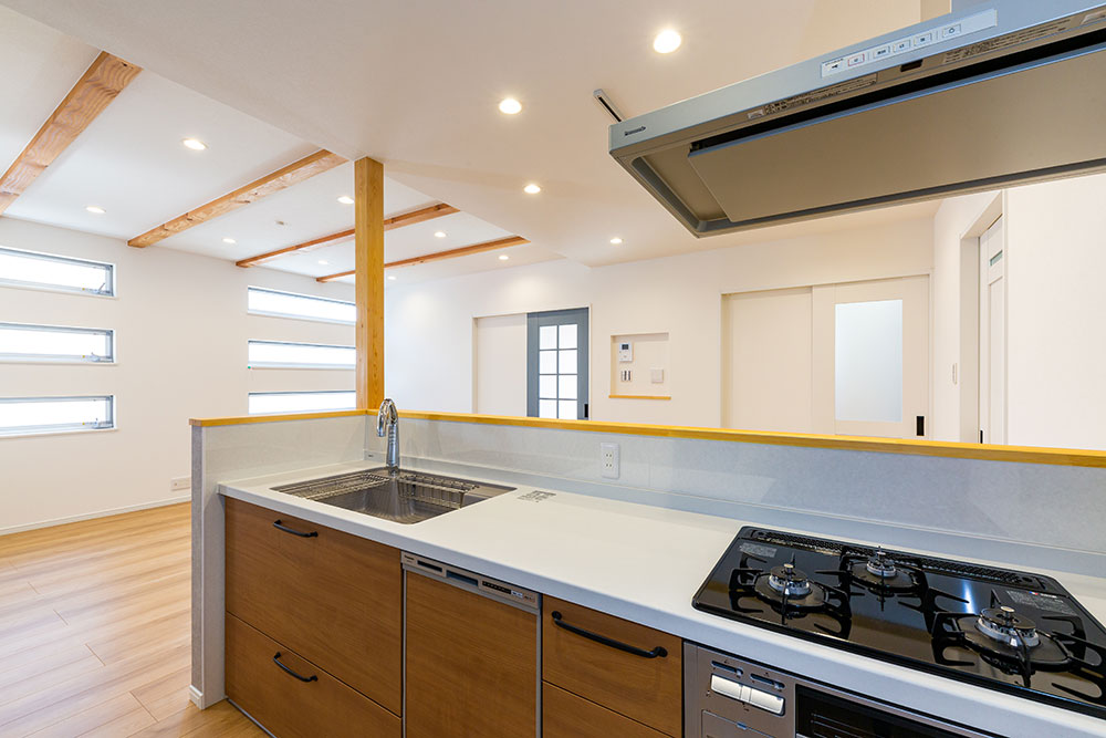木の梁が映えるお家ドアやキッチン等ニュアンスカラーでまとめることで木の梁が映えるとってもおしゃれなお家になりました。照明器具はダウンライトにすることで出っ張りがなくとてもすっきりとし、ほこりもたまらないのでお掃除も楽々です。玄関横のシューズクローゼットやたっぷりと収納できるウォークインクローゼット、窓の高さや形など奥様のこだわりがいっぱい詰まった素敵なお家です。