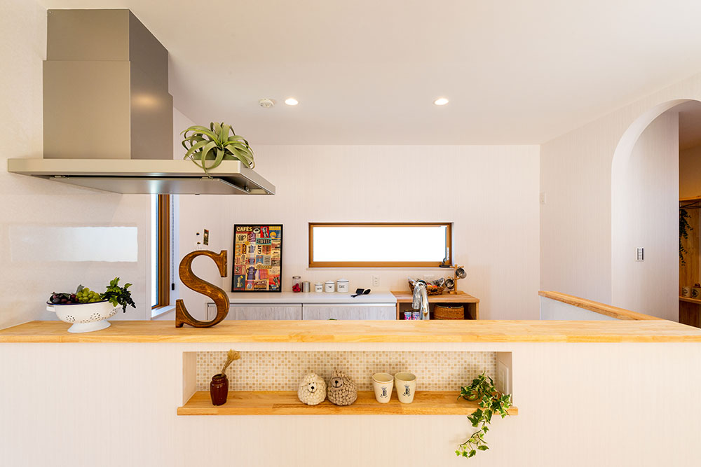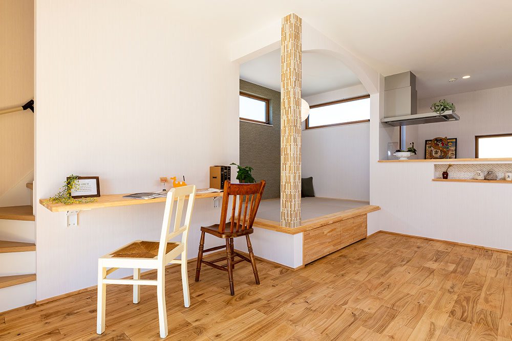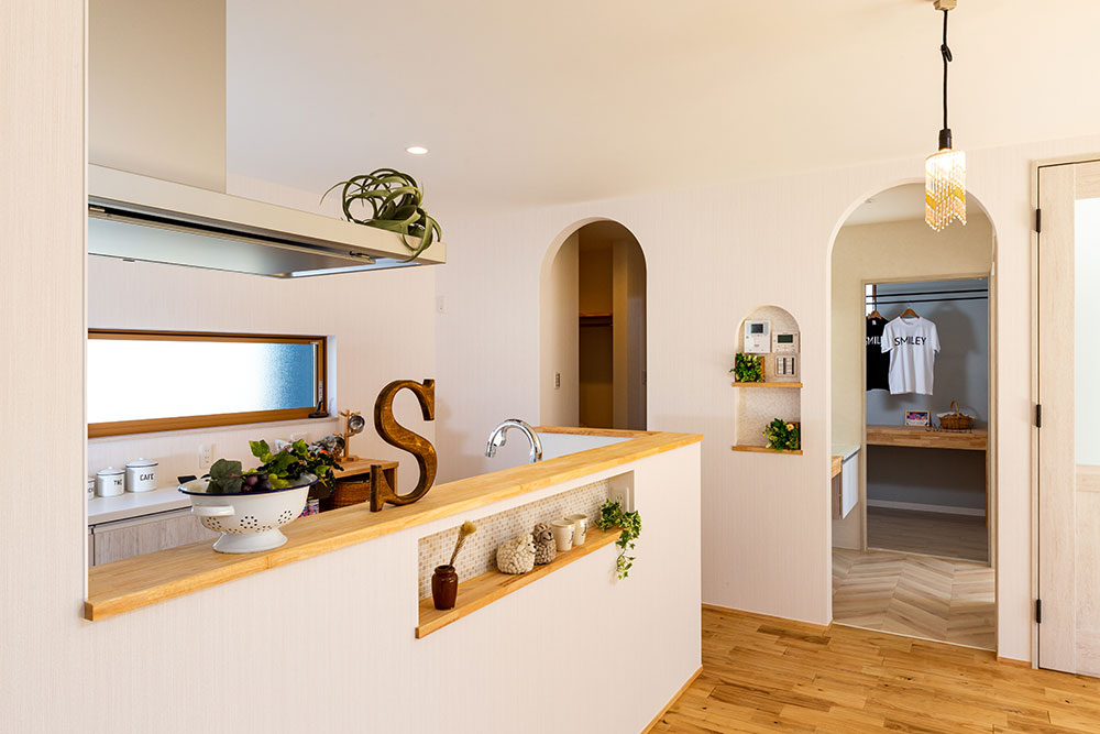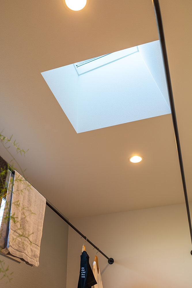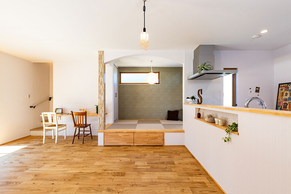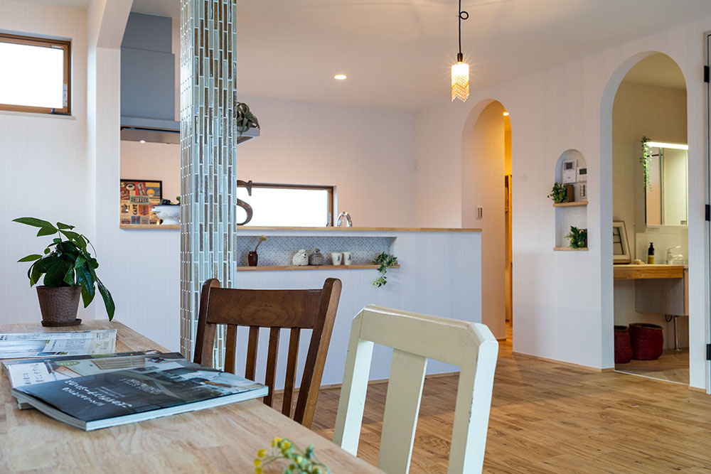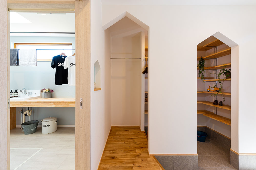 玄関からの導線は生活をシミュレーションし、お打ち合わせを繰り返し設計させていただきました。1階は全てを回遊できる造りになっていますので家事がとても楽になります。自慢のランドリールームには天窓がありとても明るい場所になりました。リビングの柱やニッチにはタイルを貼ることでお部屋のアクセントになりとてもかわいいお家になりました。