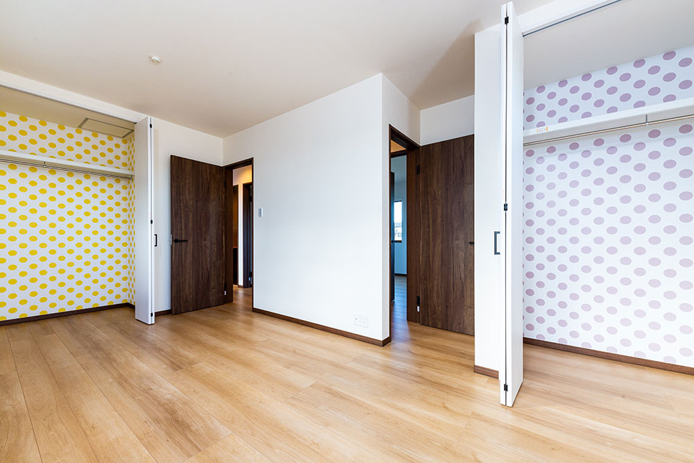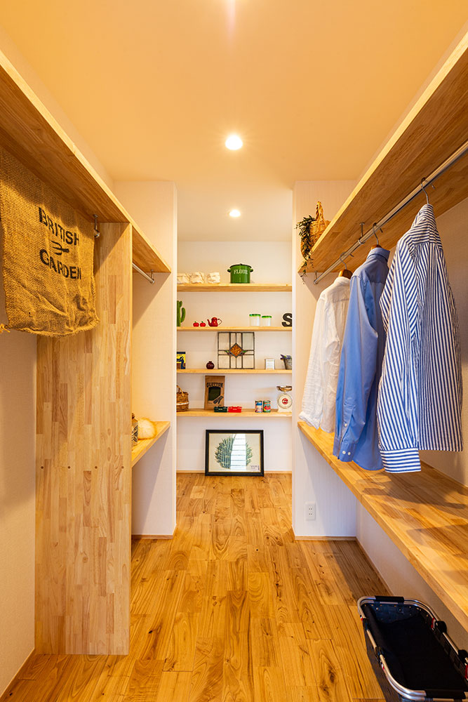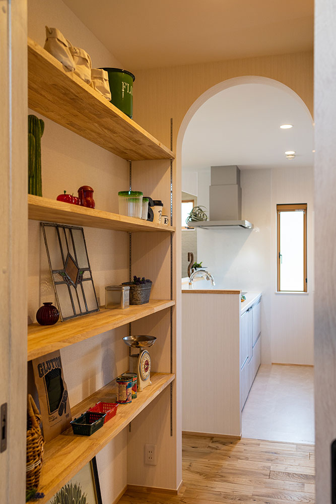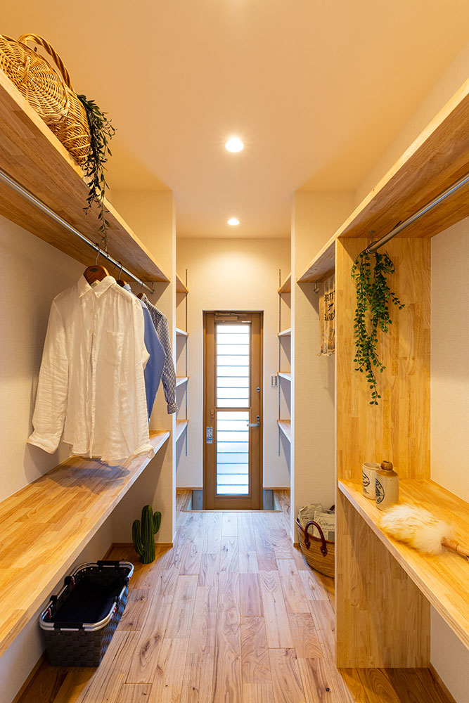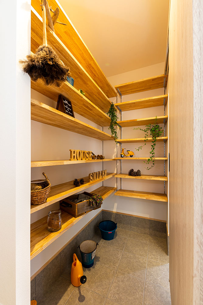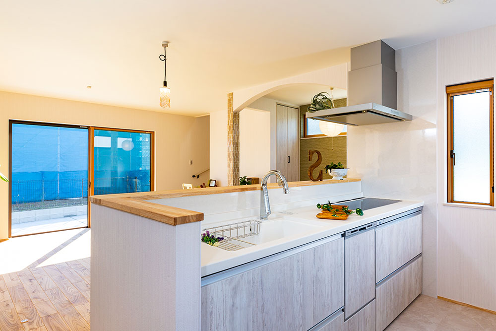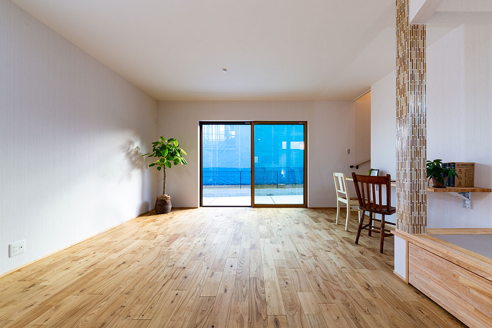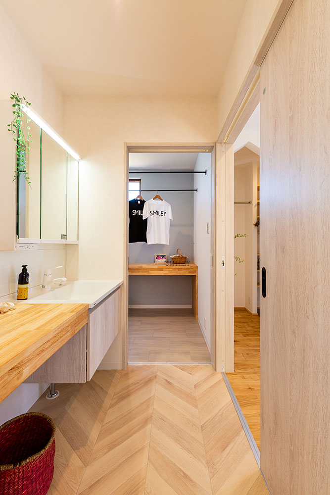 玄関からの導線は生活をシミュレーションし、お打ち合わせを繰り返し設計させていただきました。1階は全てを回遊できる造りになっていますので家事がとても楽になります。自慢のランドリールームには天窓がありとても明るい場所になりました。リビングの柱やニッチにはタイルを貼ることでお部屋のアクセントになりとてもかわいいお家になりました。