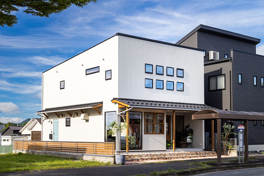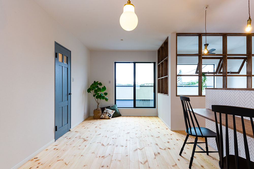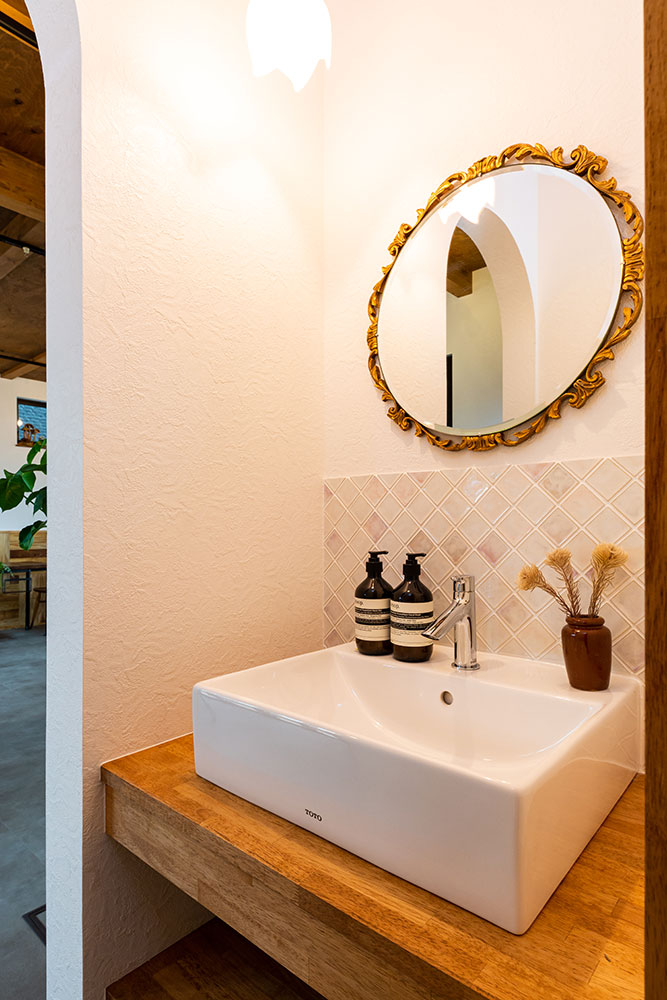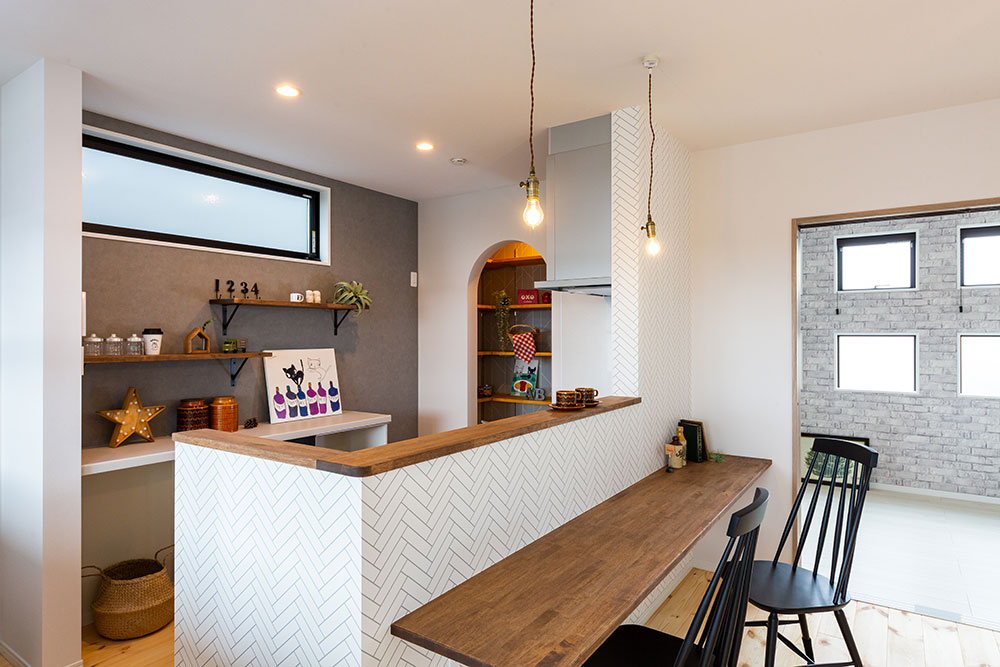 ピザ窯のあるフレンチシャビーなお家1Fと2Fで雰囲気をガラッと変えて全く違うテイストにしてみました。アンティークの椅子やオーダーのテーブルに合うよう、腰かべをランダムに貼ったりと、こだわりいっぱいのお家になりました。