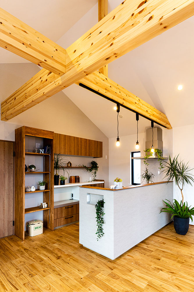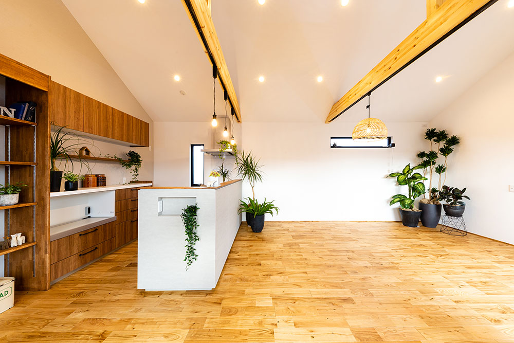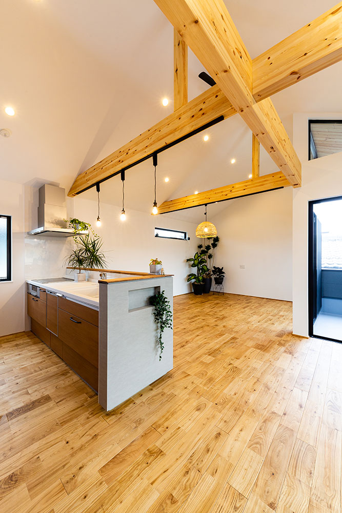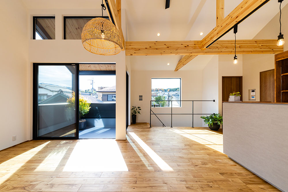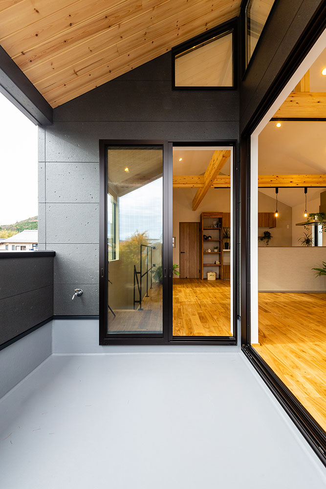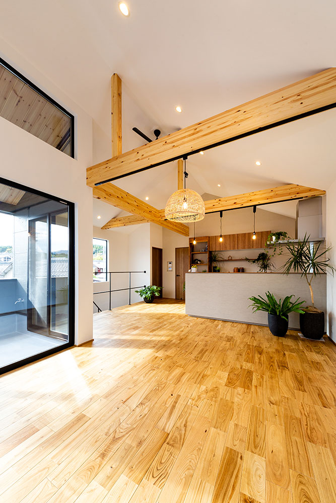 2階リビングのお家リビングを2階にし、勾配天井にしたり大きな窓を配置することで明るく開放的な空間になりました。 アイアンの手すり、大きなバルコニーの天井に木を張ったり、土間玄関を広くしておしゃれだけど実用的なスペースにしました。