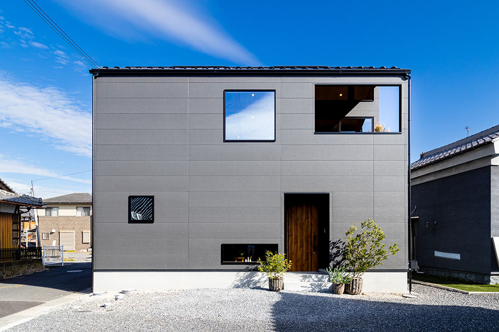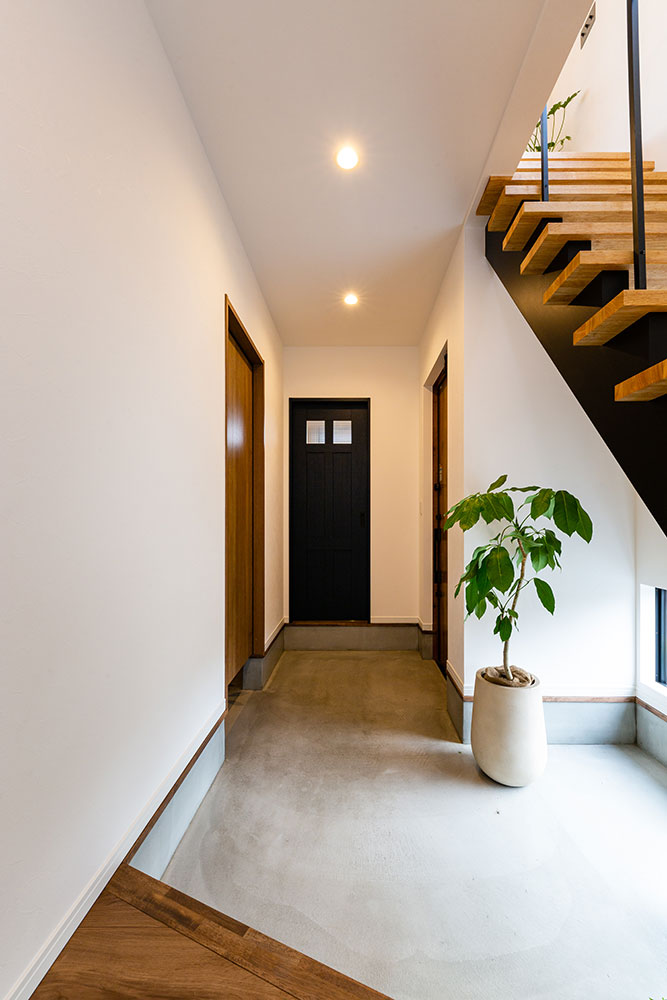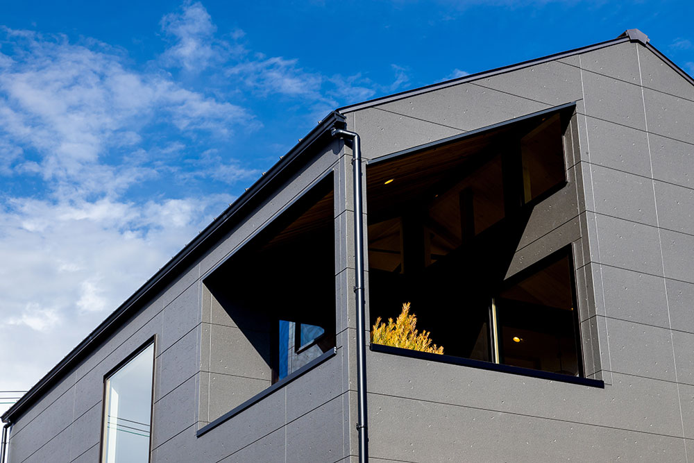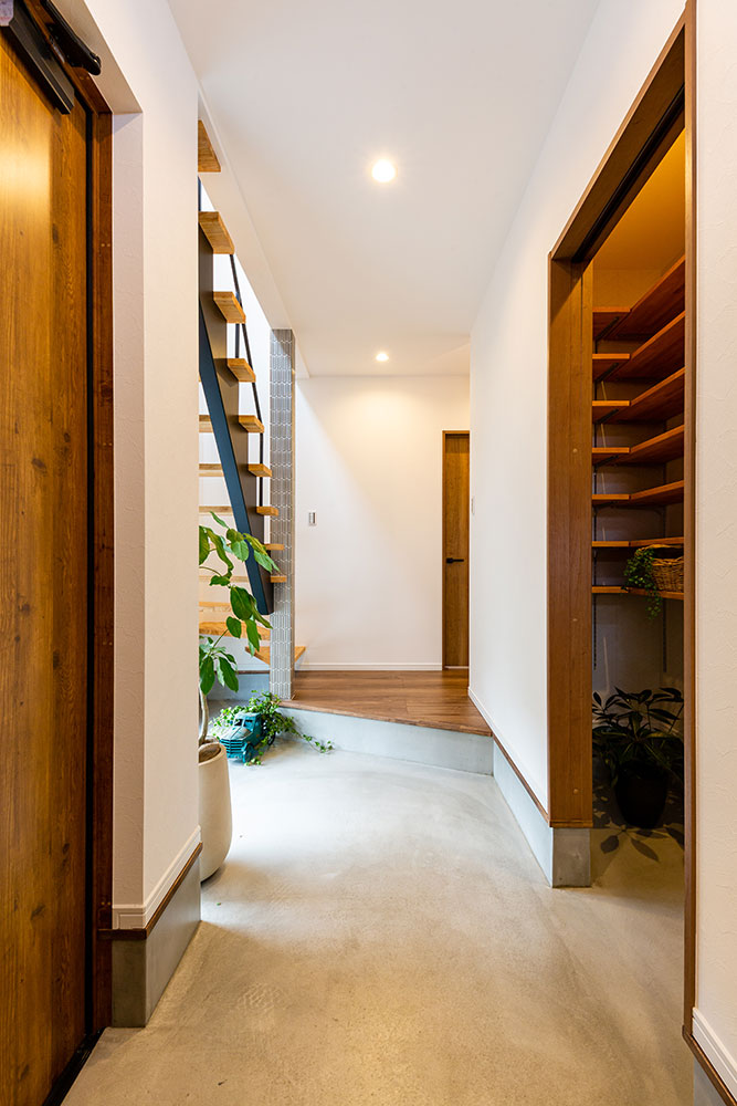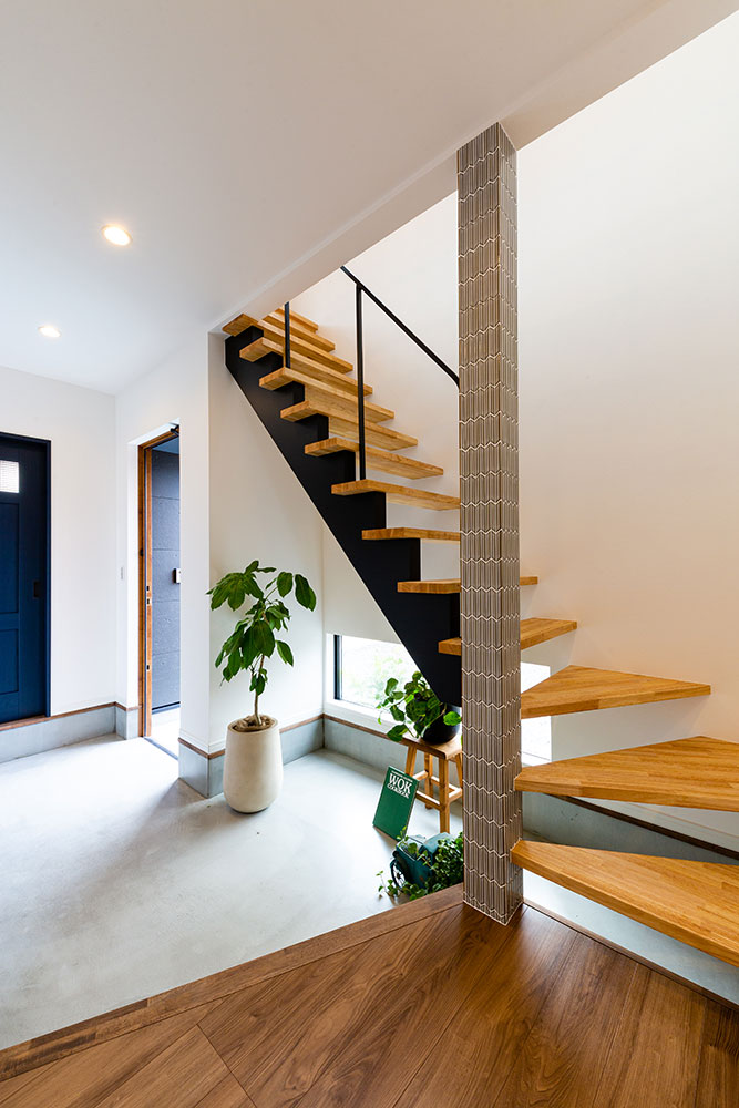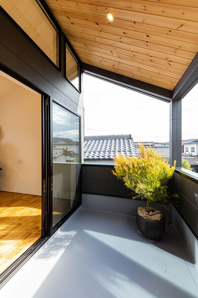 2階リビングのお家リビングを2階にし、勾配天井にしたり大きな窓を配置することで明るく開放的な空間になりました。 アイアンの手すり、大きなバルコニーの天井に木を張ったり、土間玄関を広くしておしゃれだけど実用的なスペースにしました。