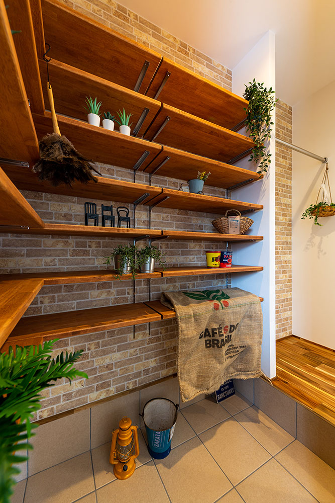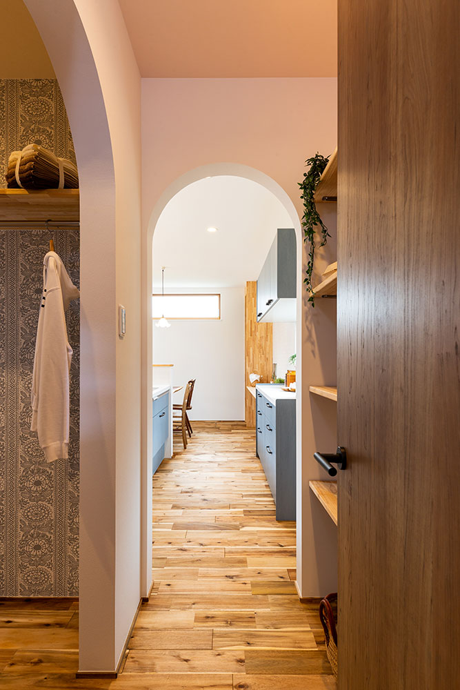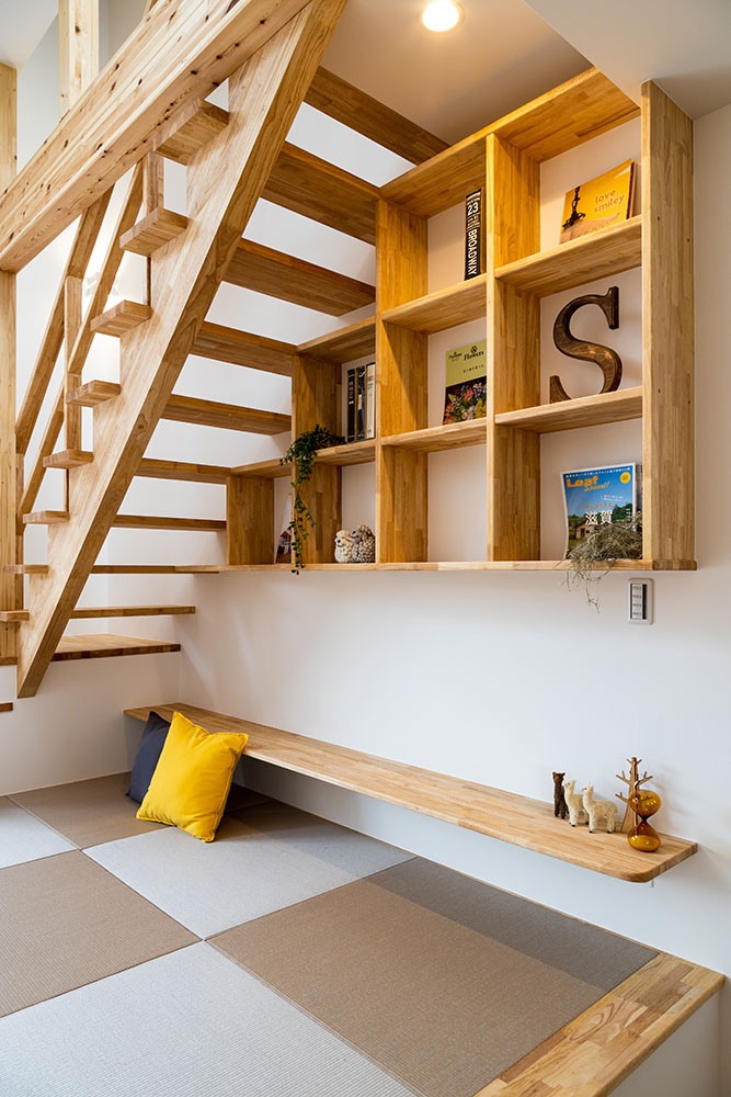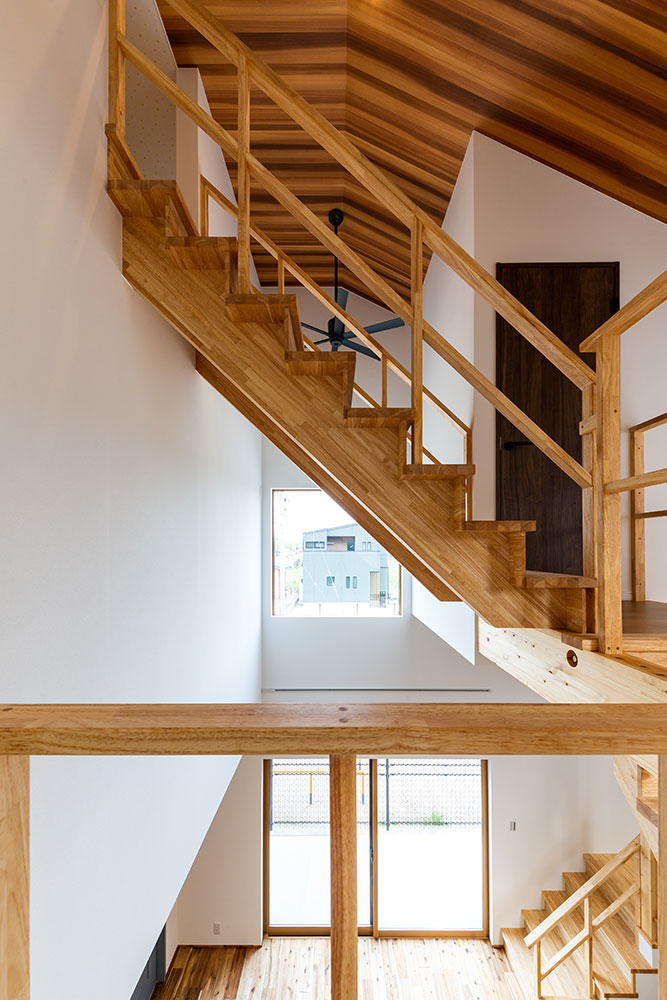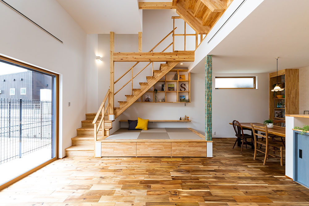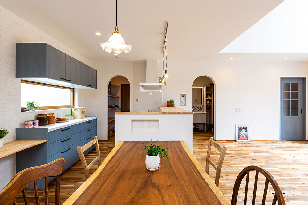 すごい階段のお家ありとあらゆる所に収納や棚などたっぷり作りました。奥様お気に入りのブルーグレーのドアやキッチンなどが、無垢の床にとても映えます。また、横ならびのダイニングテーブルも一枚板にするなどこだわりいっぱいのお家になりました。