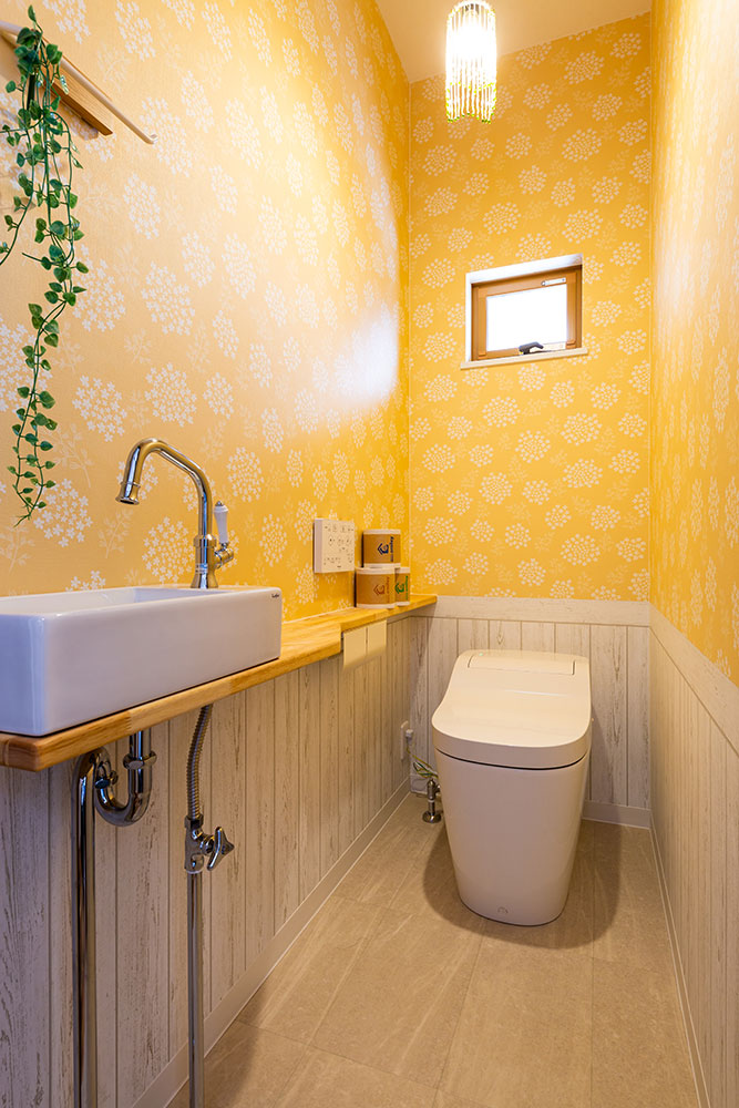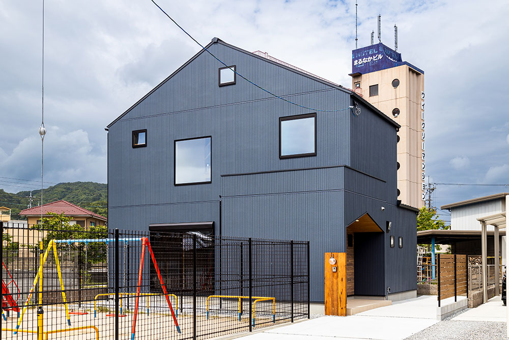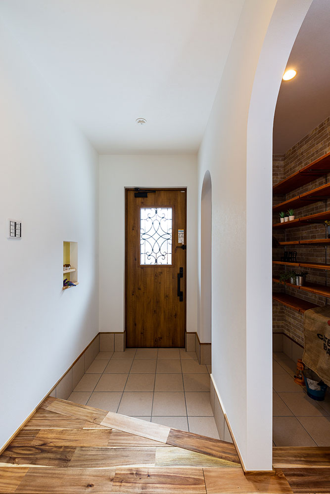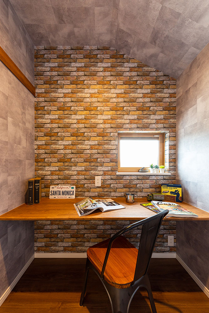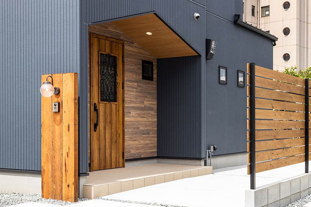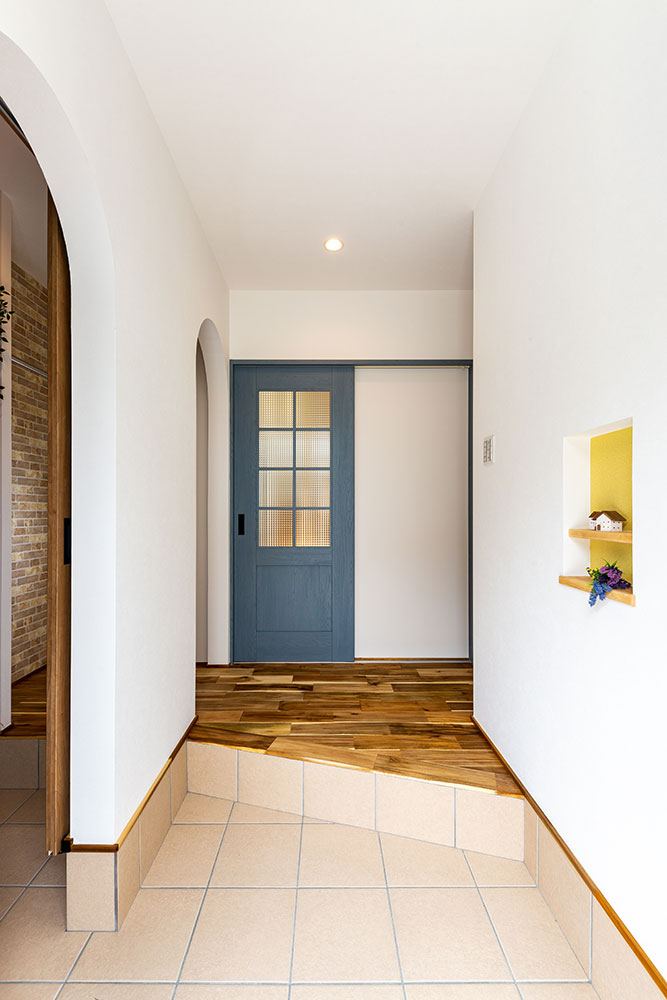 すごい階段のお家ありとあらゆる所に収納や棚などたっぷり作りました。奥様お気に入りのブルーグレーのドアやキッチンなどが、無垢の床にとても映えます。また、横ならびのダイニングテーブルも一枚板にするなどこだわりいっぱいのお家になりました。