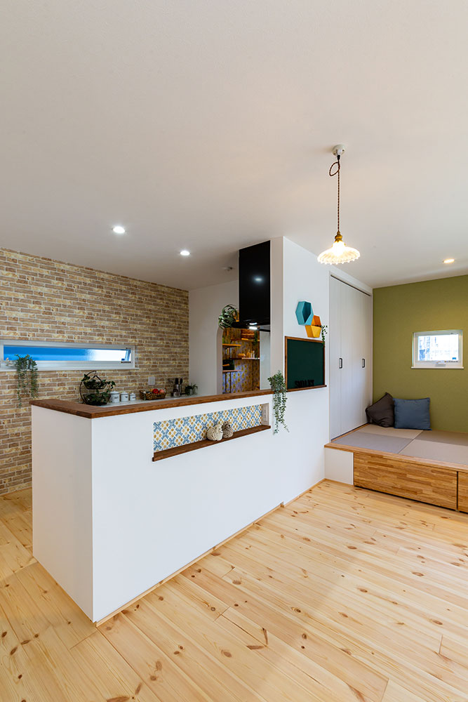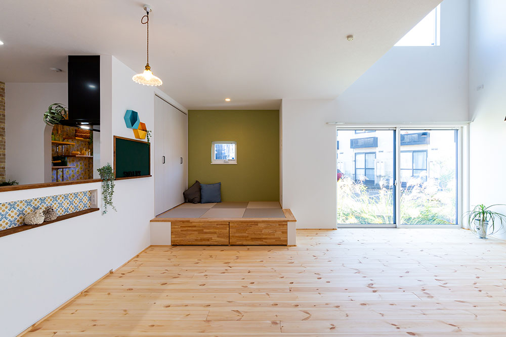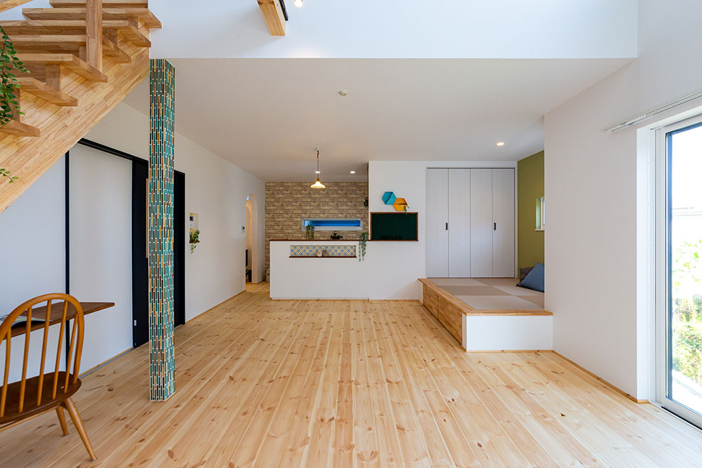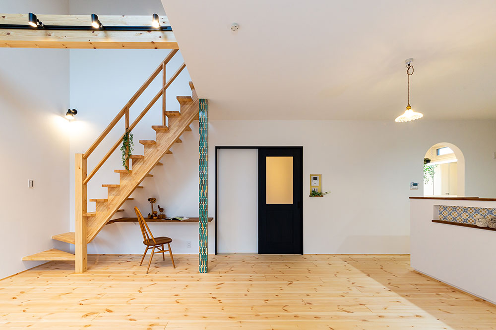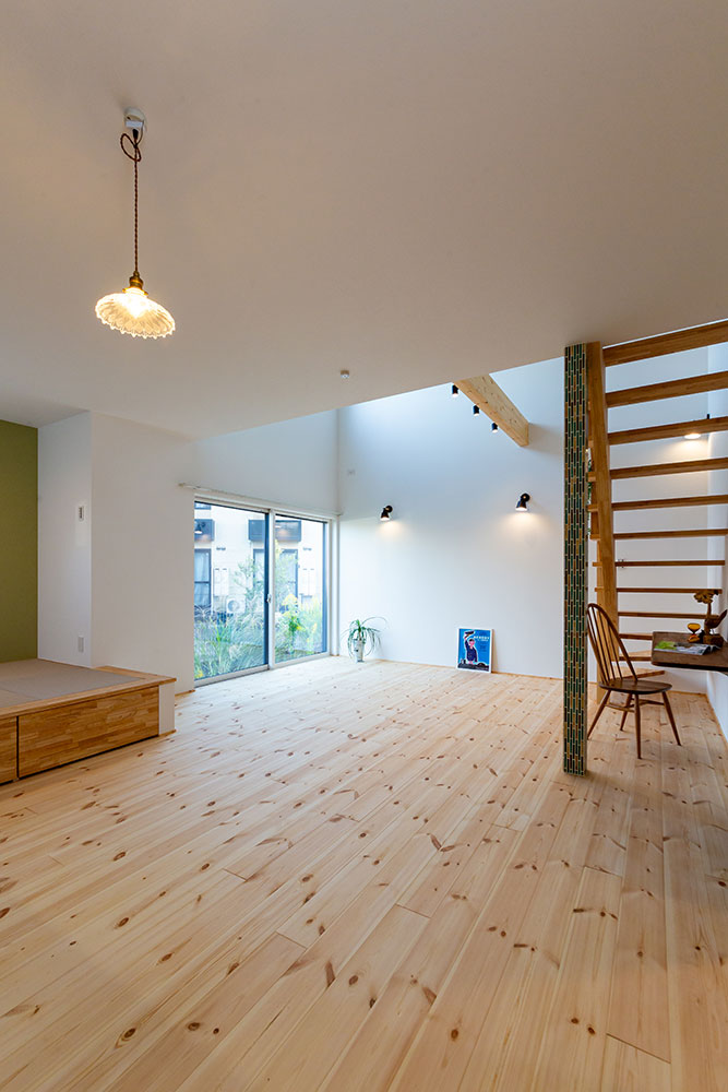 ロフトのあるお家吹抜けのある明るいリビングは無垢の床が優しい雰囲気にしてくれます。小上がりのタタミスペースやスタディスペース、パントリーを兼ねた奥さま部屋♥ご主人の趣味部屋にもなるロフトは収納力たっぷりです。玄関からの動線やキッチンを中心にした家事動線にもこだわりました。建物正面に大きなFIX窓を2ヶ所設けることで自然光がたっぷり入るデザイン性と実用性を兼ね備えたお家になりました。
