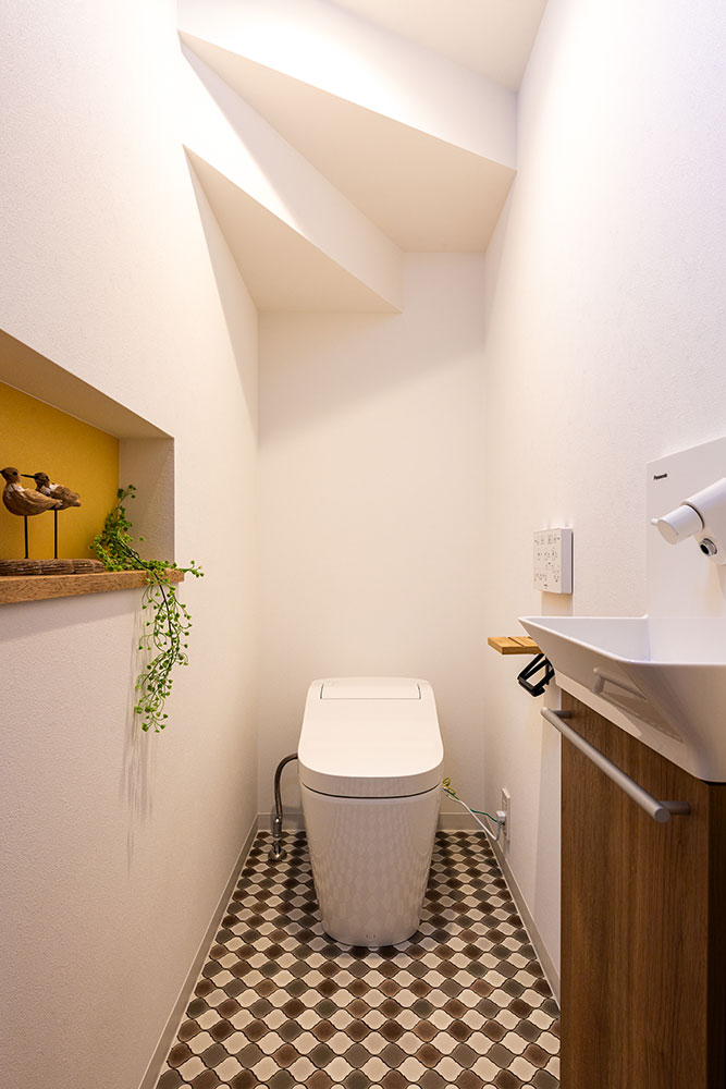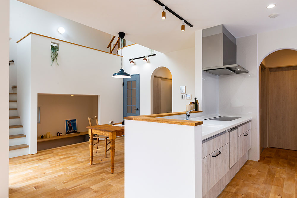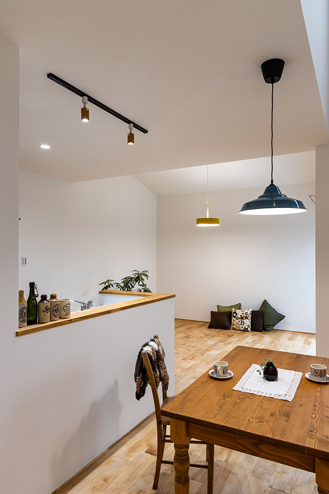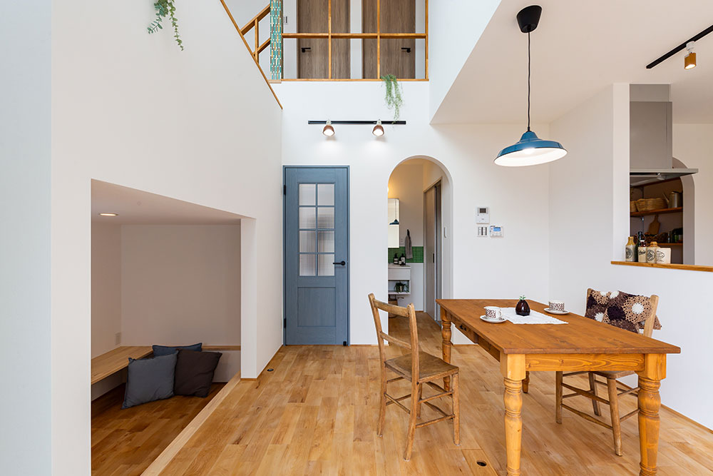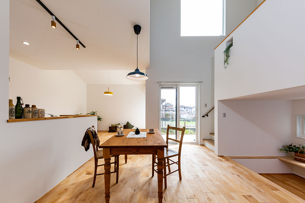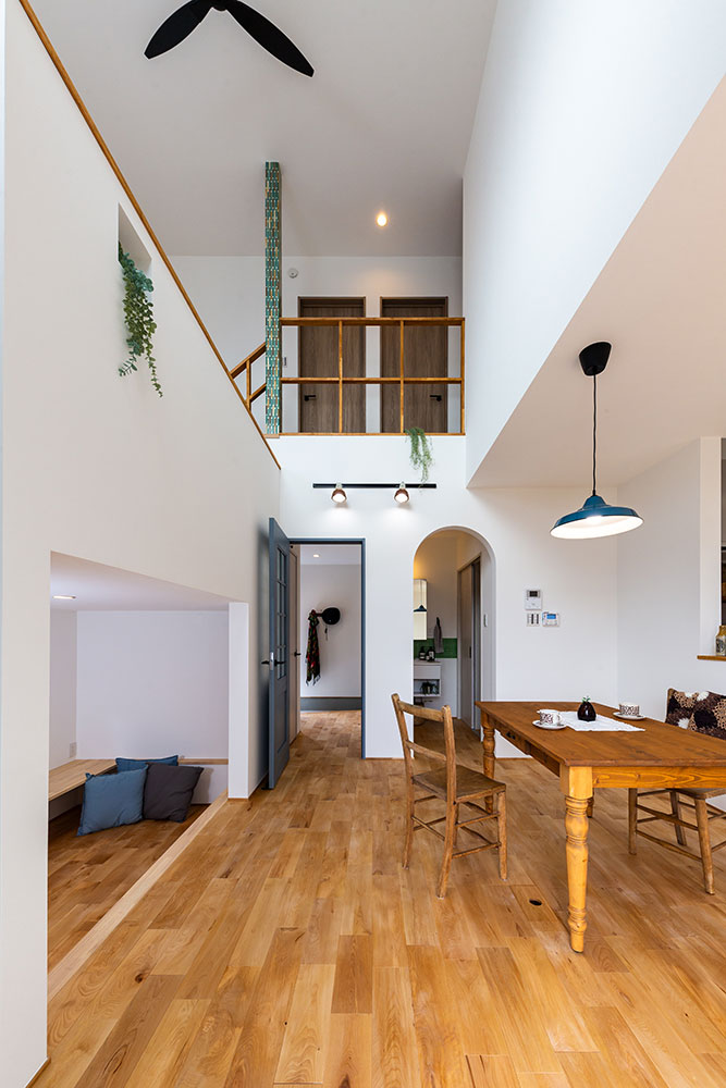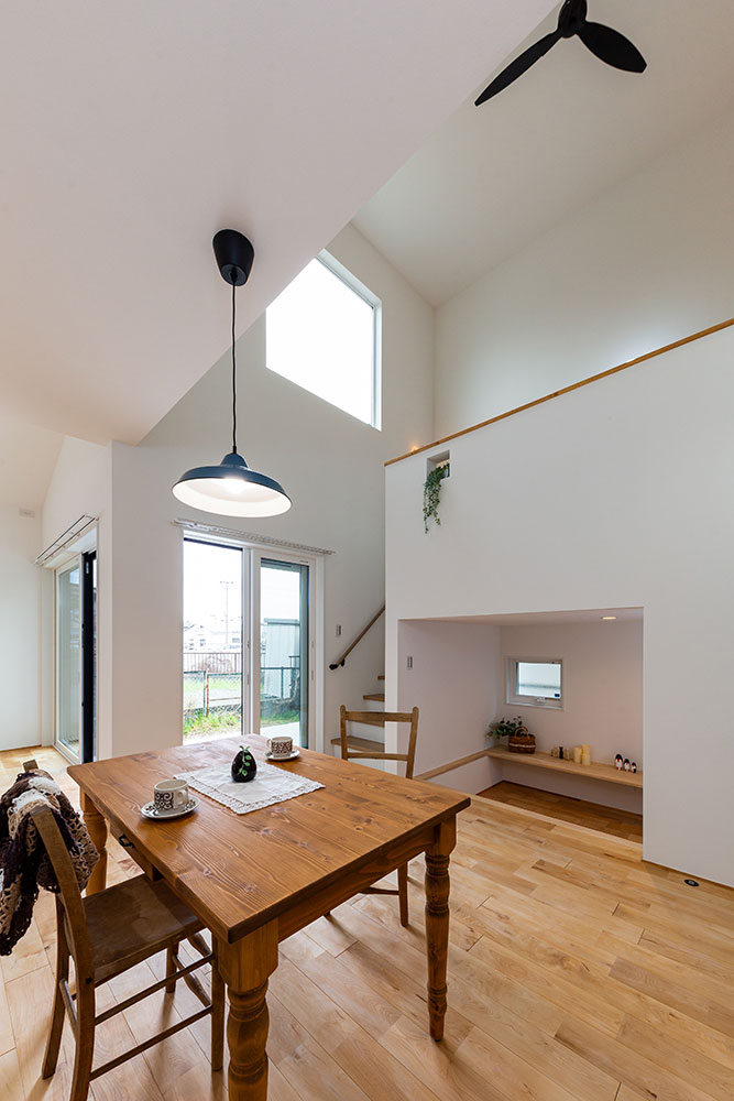 お家の中に入ると吹抜けからのあたたかく優しい光がふりそそぐ明るいリビング、ダイニングにはまるで「秘密基地」のようなスペースを作りました。キッチンからも目が届くのでキッズルームにもいいですね。。。リビングの天井を勾配天井にすることでとても開放的になりました。
