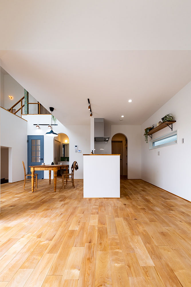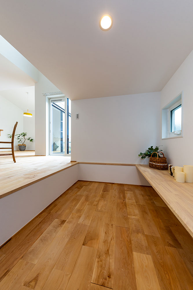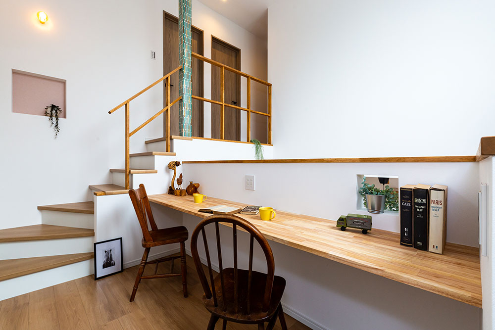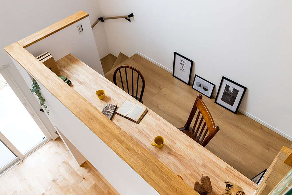 ご主人こだわりの『ギャラリースペース』をスキップフロアに設けることで空間を有効的に使えるよう設計しました。家族の気配や声は感じるけど、ちょうどほど良い『籠る』感のあるスペースになりました。