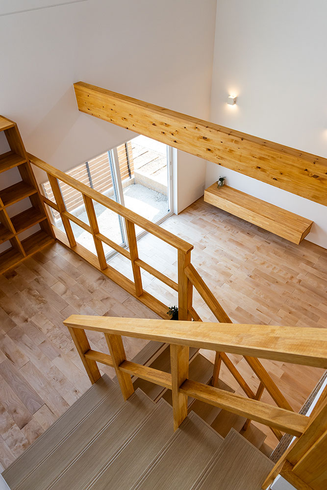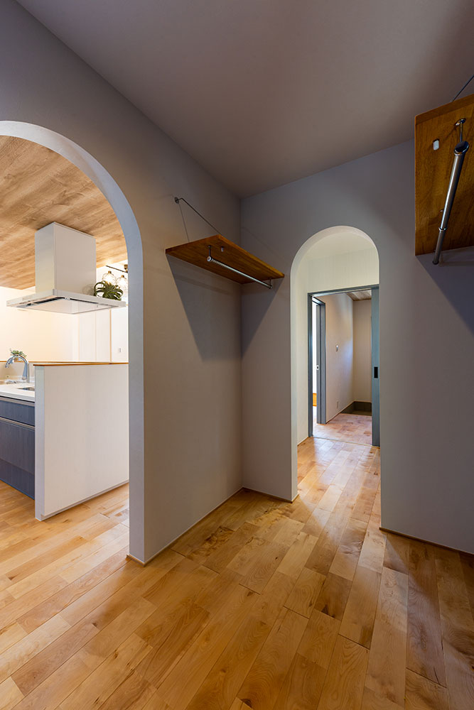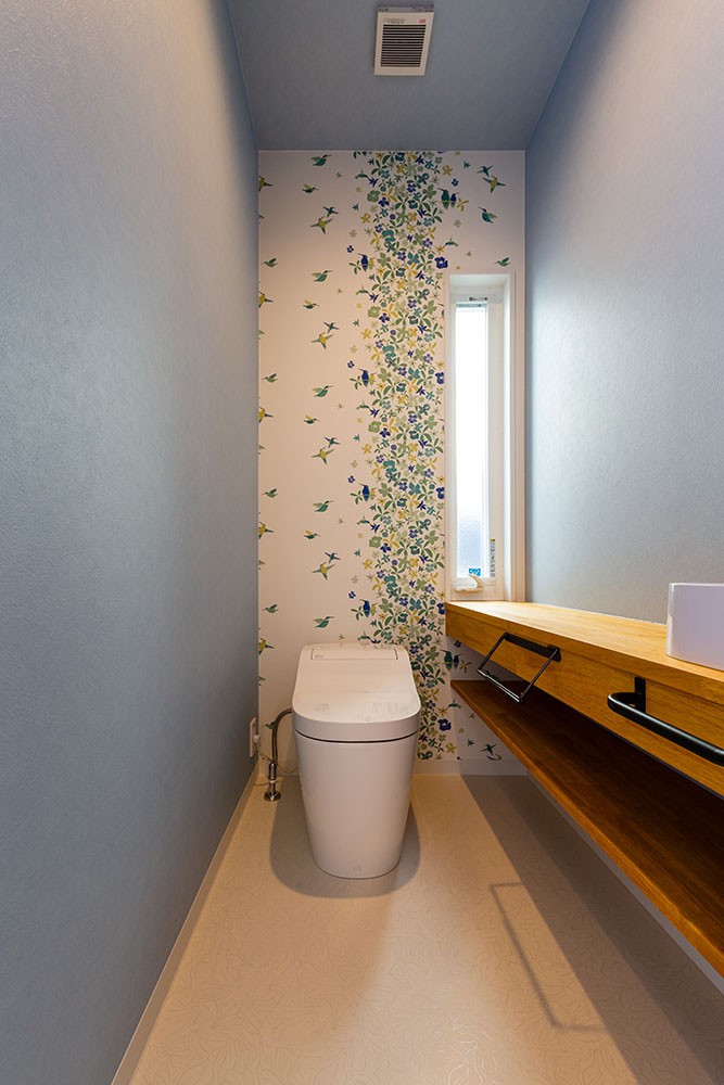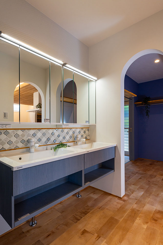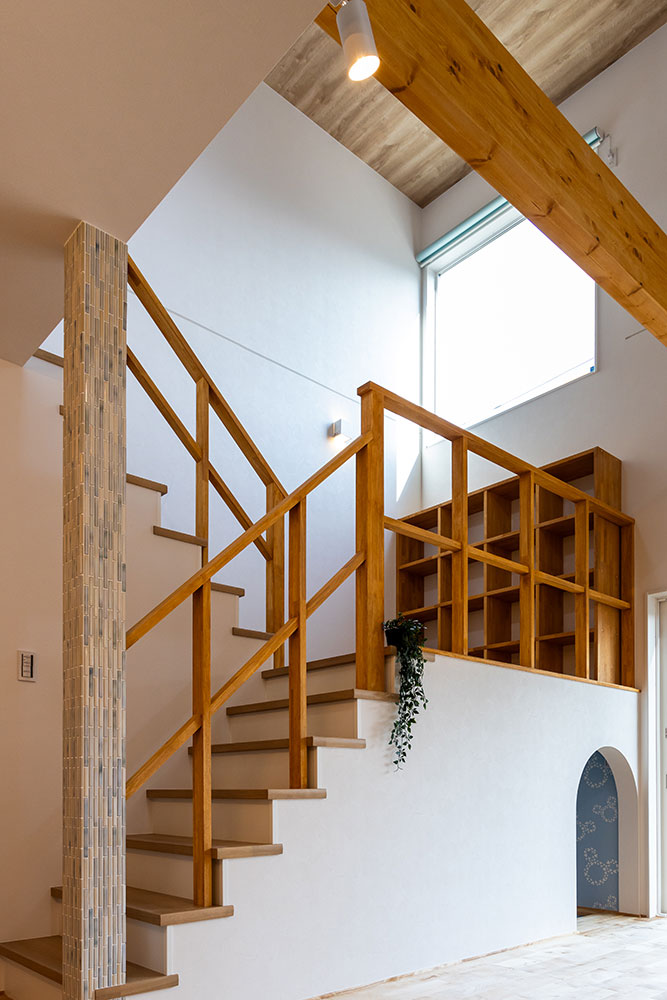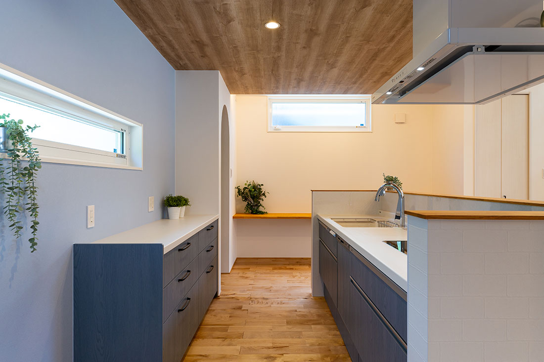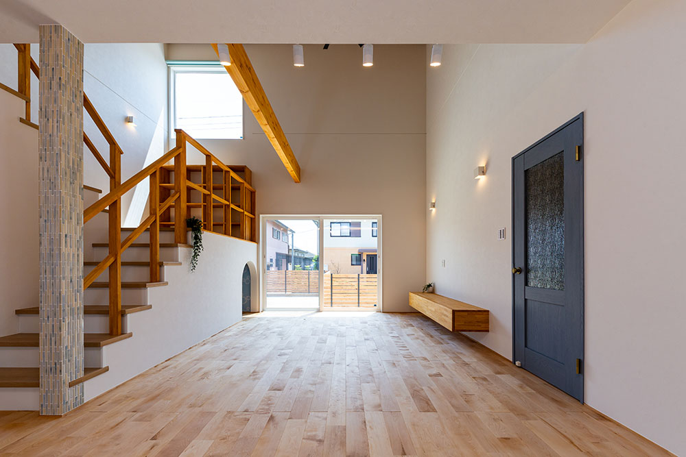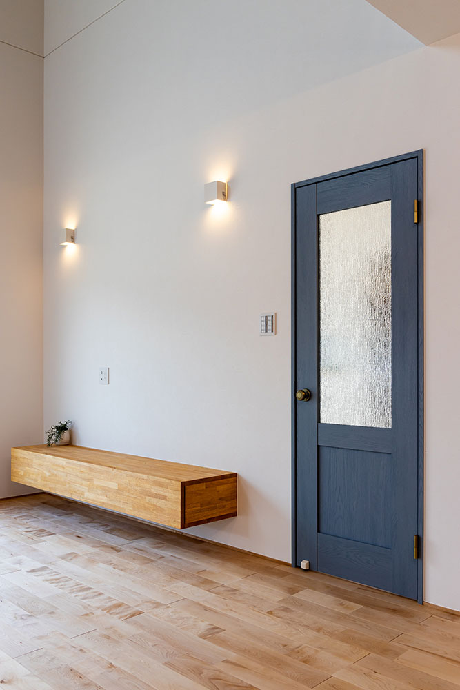 ブルーがかわいいお家お家の中に入るとまず、ブルーのかわいいドアが出迎えてくれます。玄関クロークは靴だけではなくお子様の外遊び道具なども収納できるよう広く設計しました。リビングの吹抜けはと~っても大きく気持ちがいいです。階段を『スキップフロア』にすることでゆったりと広々とした空間にしました。水まわりも『ウォークスルー』で動きやすく回遊動線なのでノンストレスです。奥さまの大好きな色にかこまれたかわいいお家になりました。