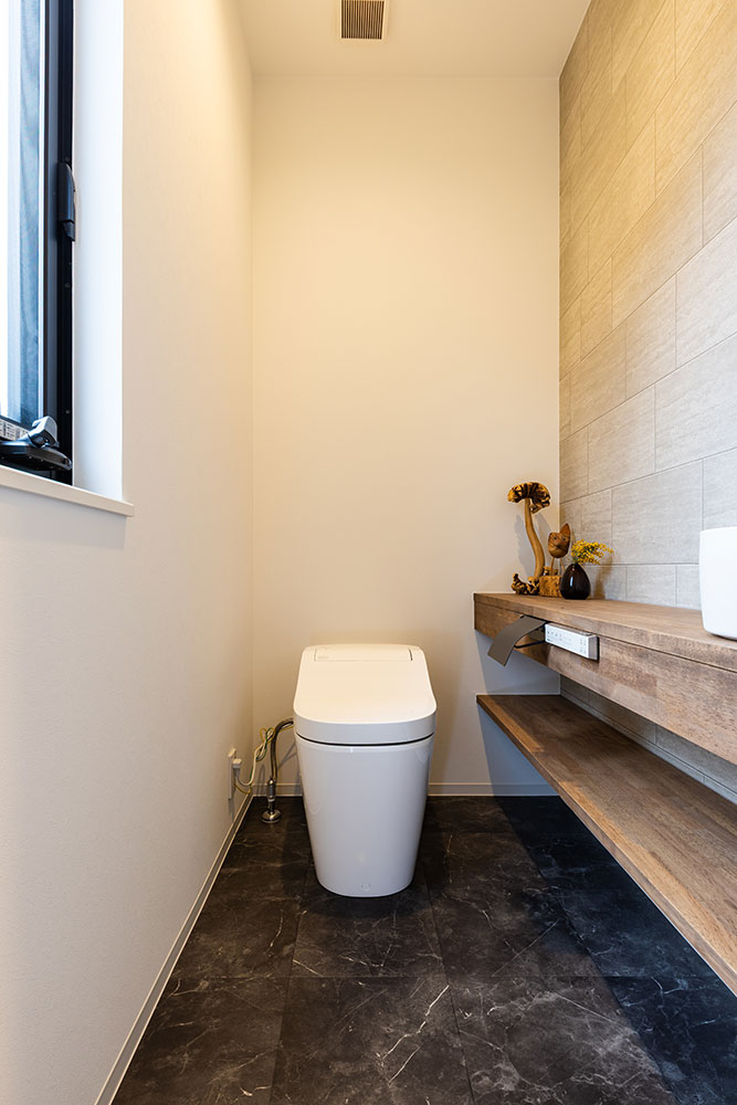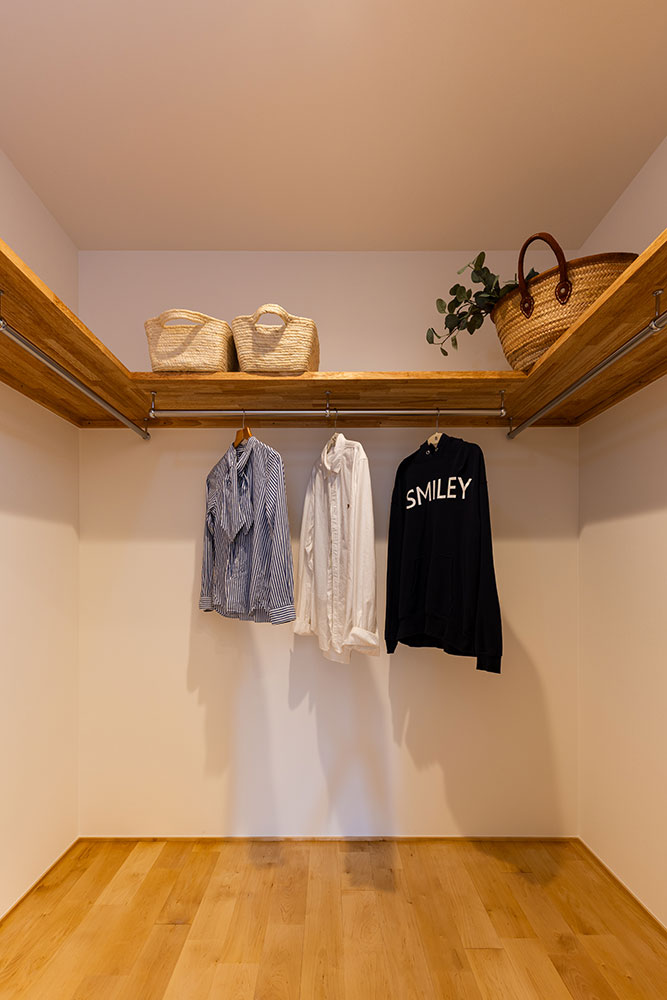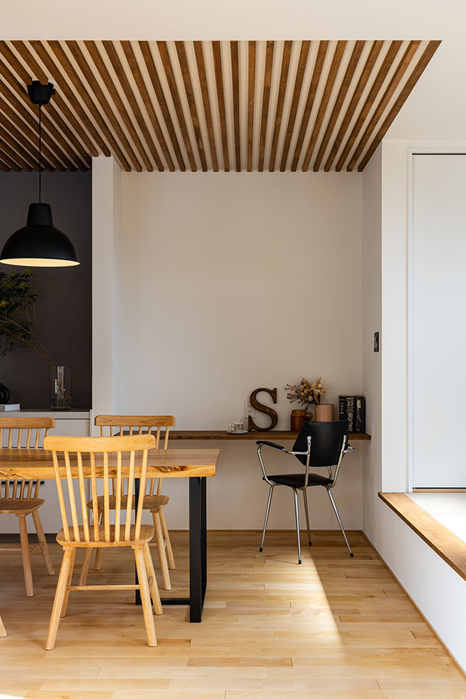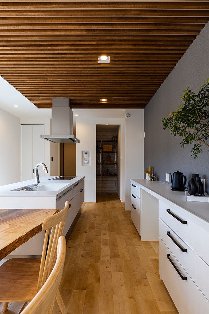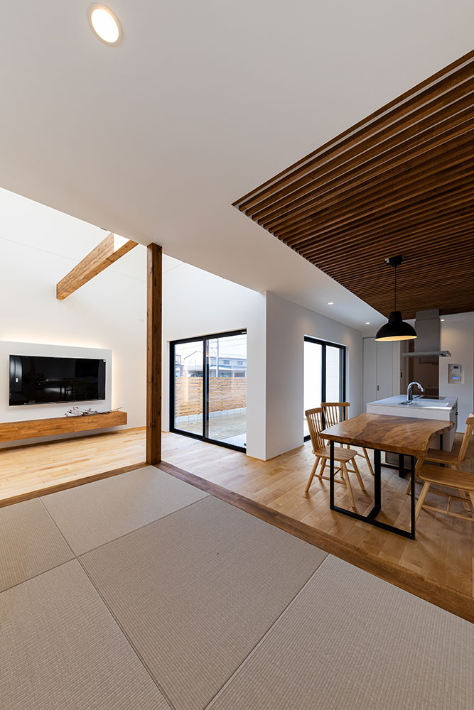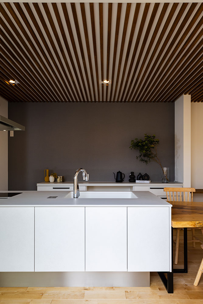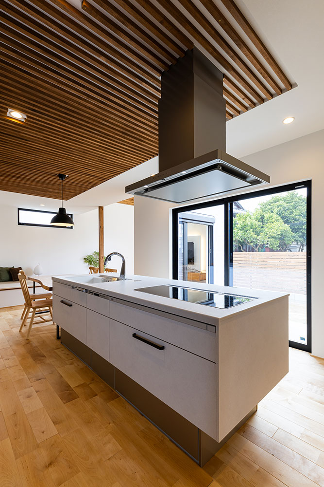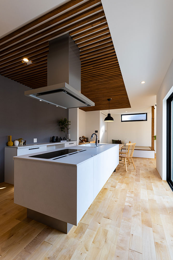 コの字型の建物は外からのプライバシーを守りながらもリビングやキッチンは明るく開放感のあるつくりです。木のルーバー天井と無垢の床が調和する温もりあふれるダイニングキッチン。北欧と日本の「いいところ」を融合させた「ジャパンディスタイル」を基調にシンプルながらも上質な空間にしました。白を基調としたアイランドキッチンは、生活感を抑えながらも使いやすい動線です。小上がりのタタミスペースは家族がくつろげる場所に。吹抜けの高窓から差し込む自然光が心地いいお家になりました。