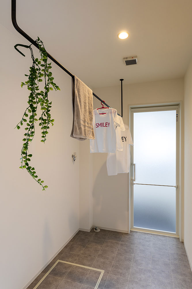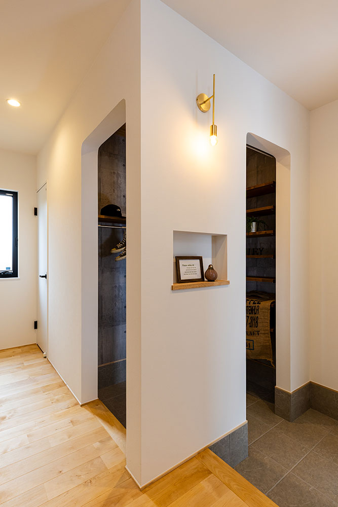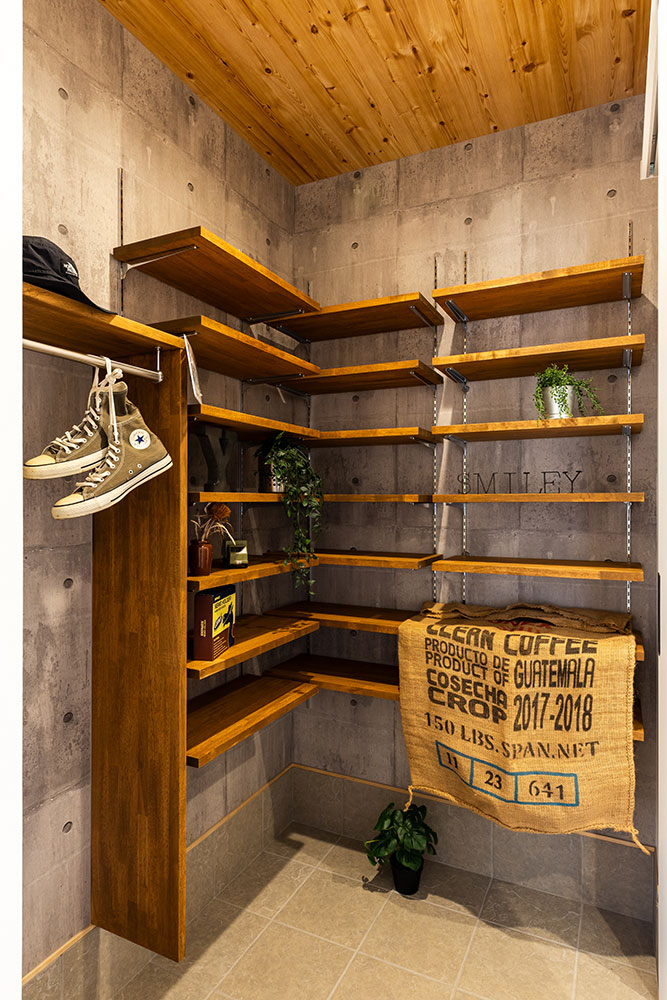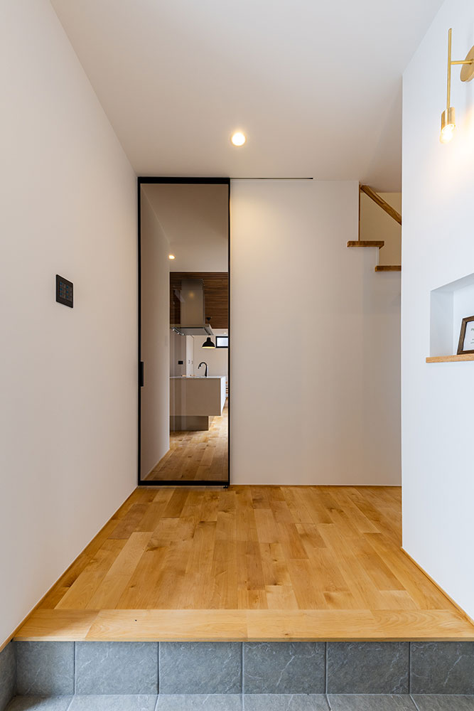 ジャパンディなお家建物正面には窓が一切なく玄関ドアも外から見えないよう設計しました。