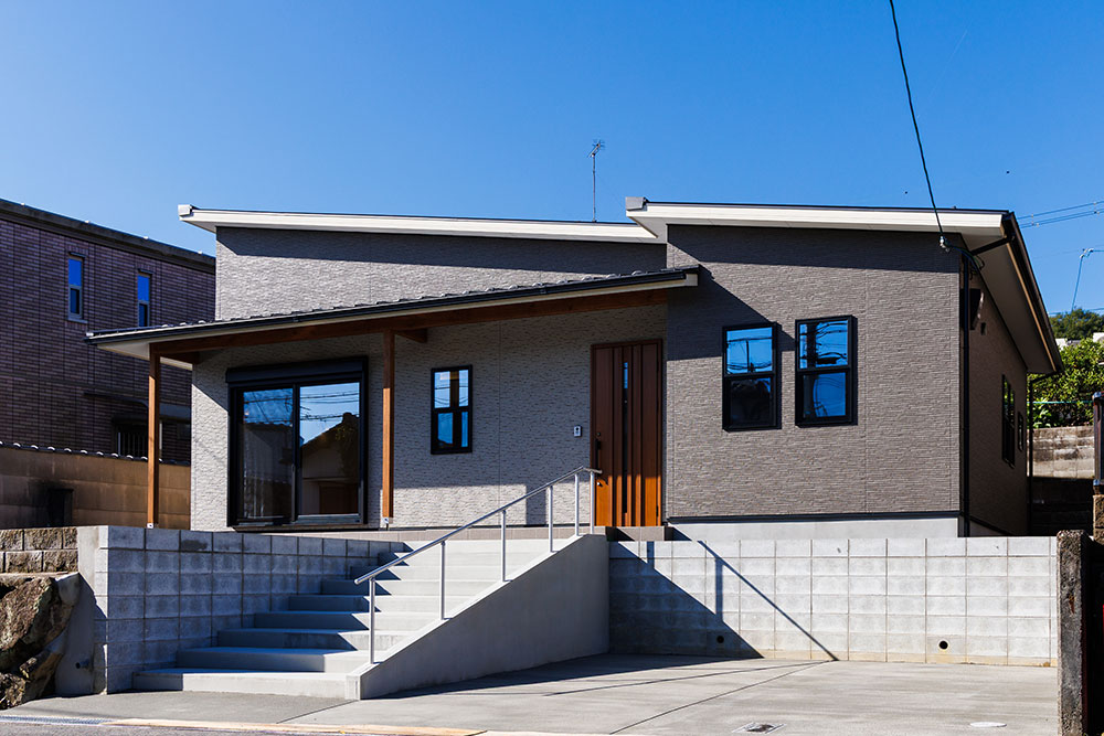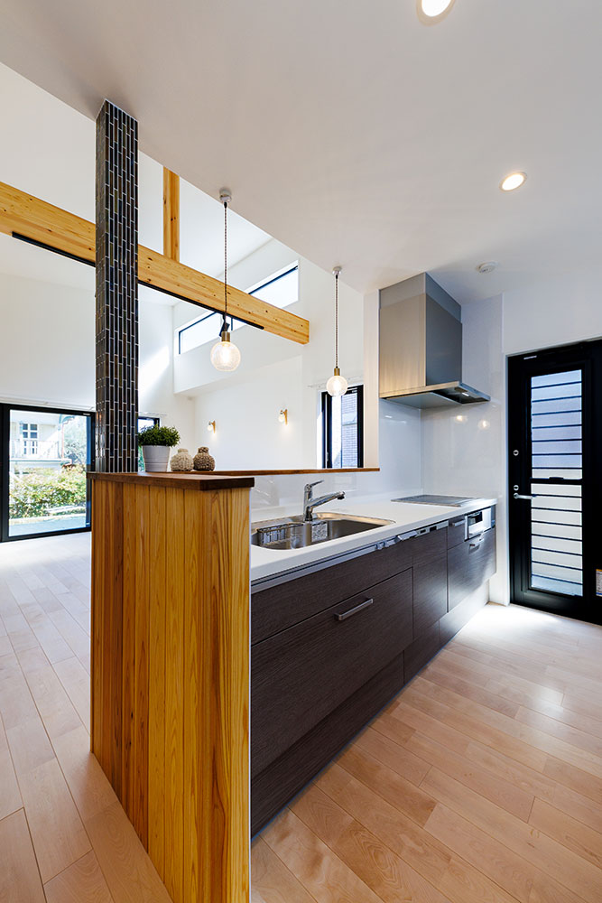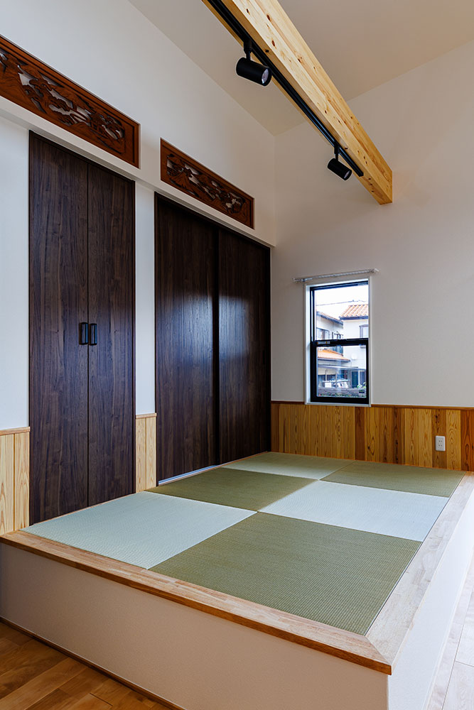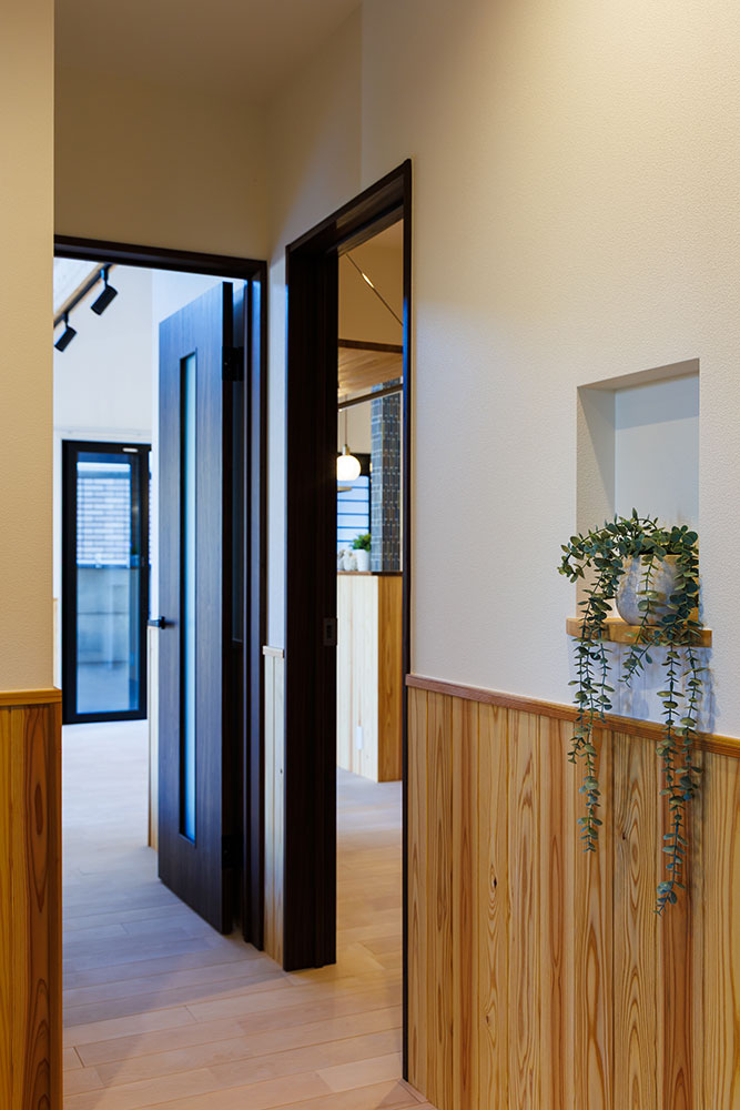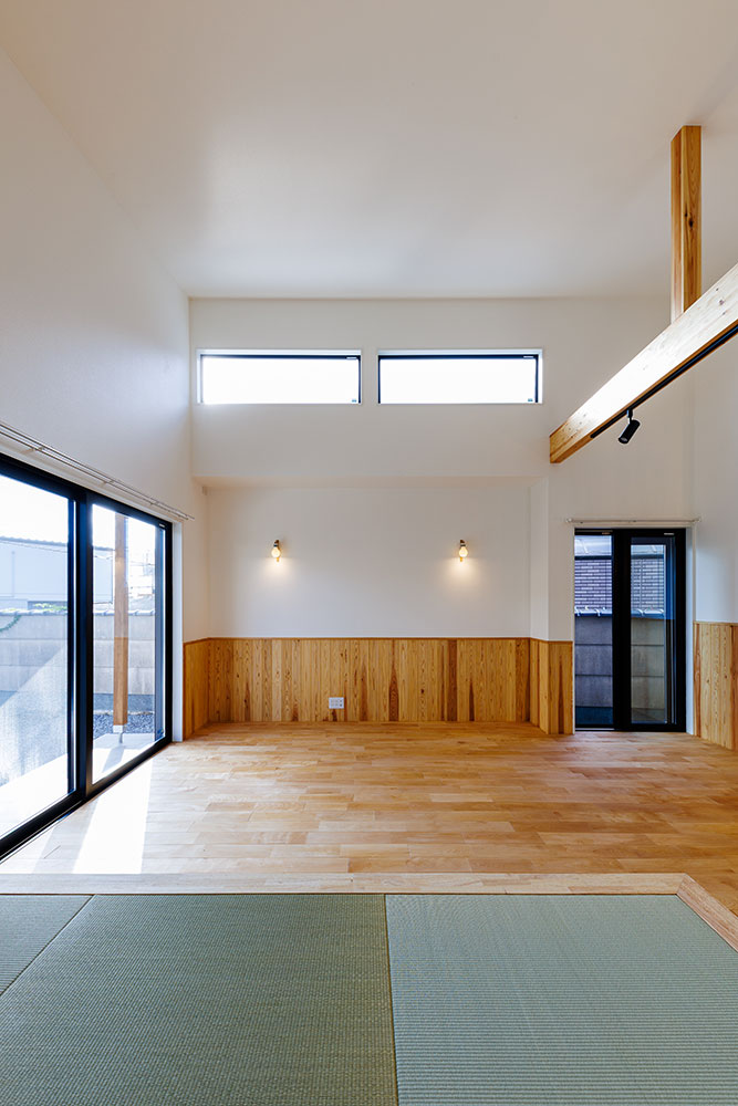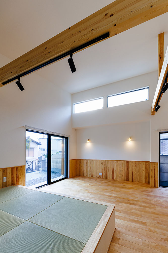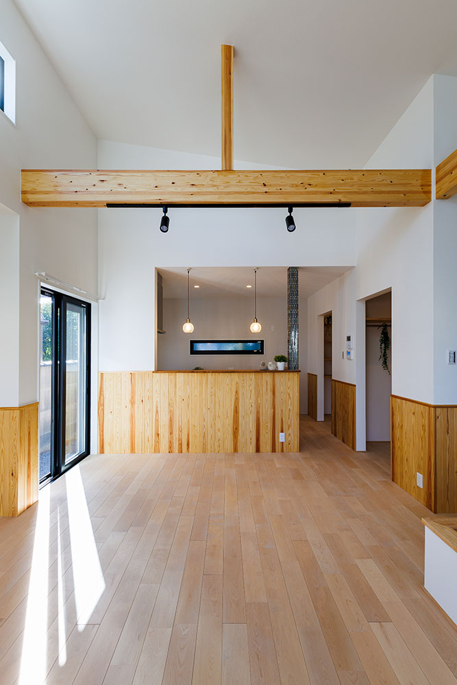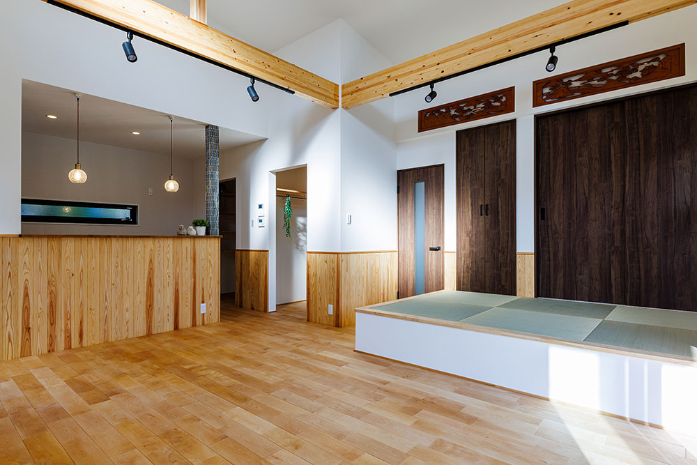 木の香りがする平屋平屋のLDKを勾配天井にして天井の高さと広がりを感じられる開放的なリビングにしました。高窓からやわらかな光が差し込み、時間帯によって表情が変わる明るくて心地いい空間が広がります。玄関からリビングまで続く木の腰壁や大きな梁がお家全体を温かくてナチュラルな優しい雰囲気に。。。小上がりのタタミスペースを設けることでくつろぎと実用性を兼ね備えた暮らしやすい平屋になりました。