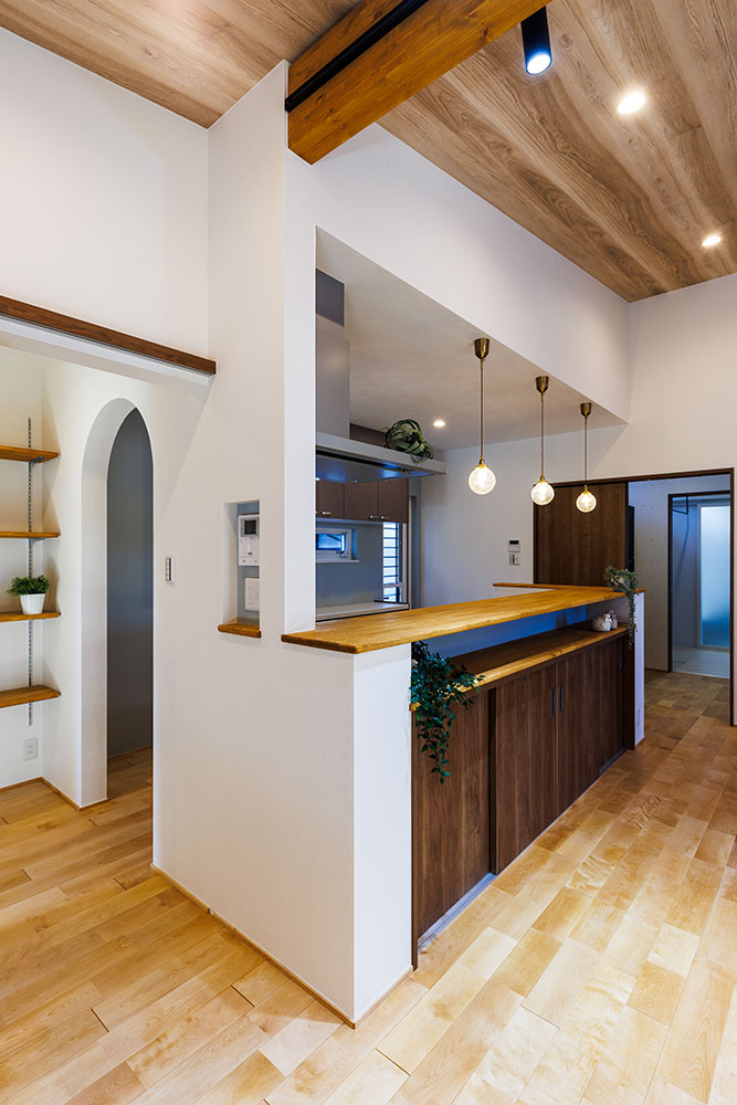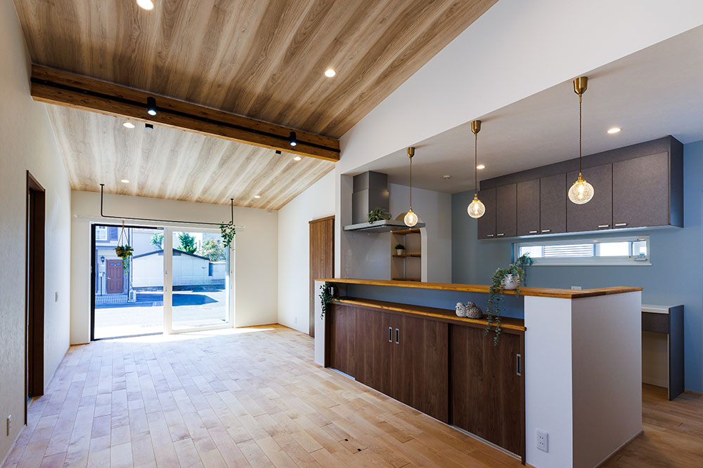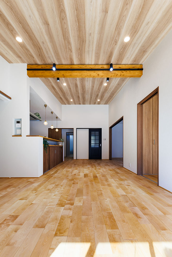 木目の壁紙がアクセントの勾配天井は、広いリビングをさらに、大空間に感じさせてくれます。