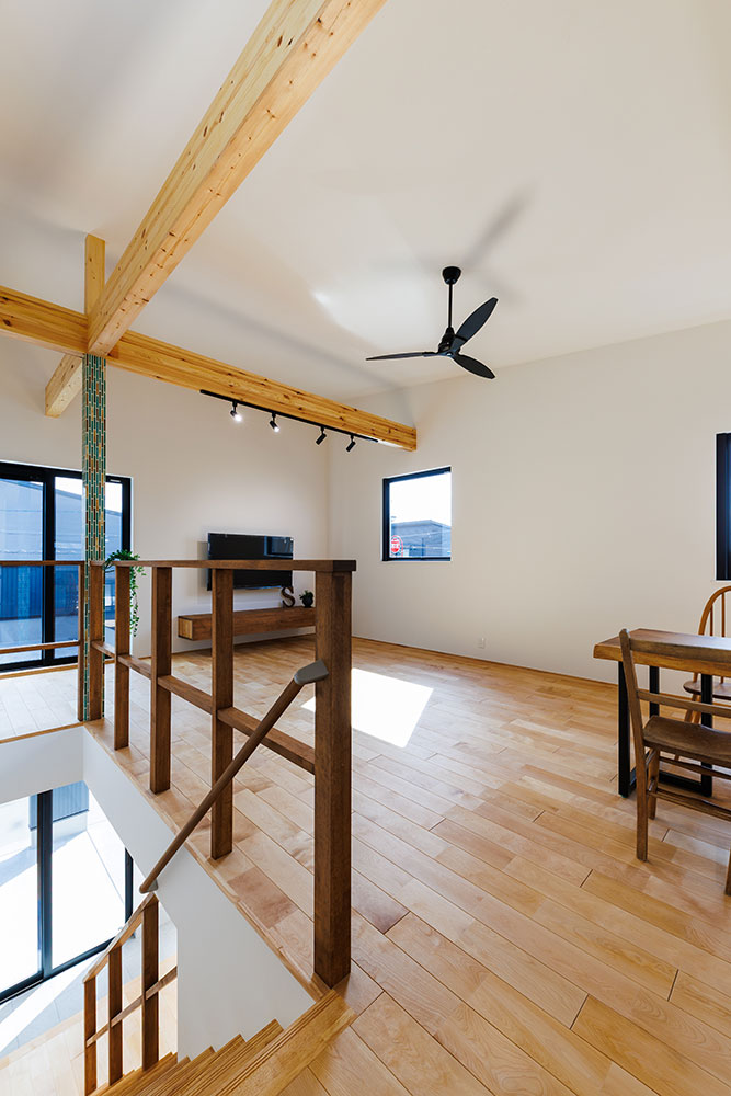 2階へ上がると勾配天井の明るくて開放的なリビング。。。光の入り方が計算された大きな窓からは自然光がたっぷりと入ってきます。