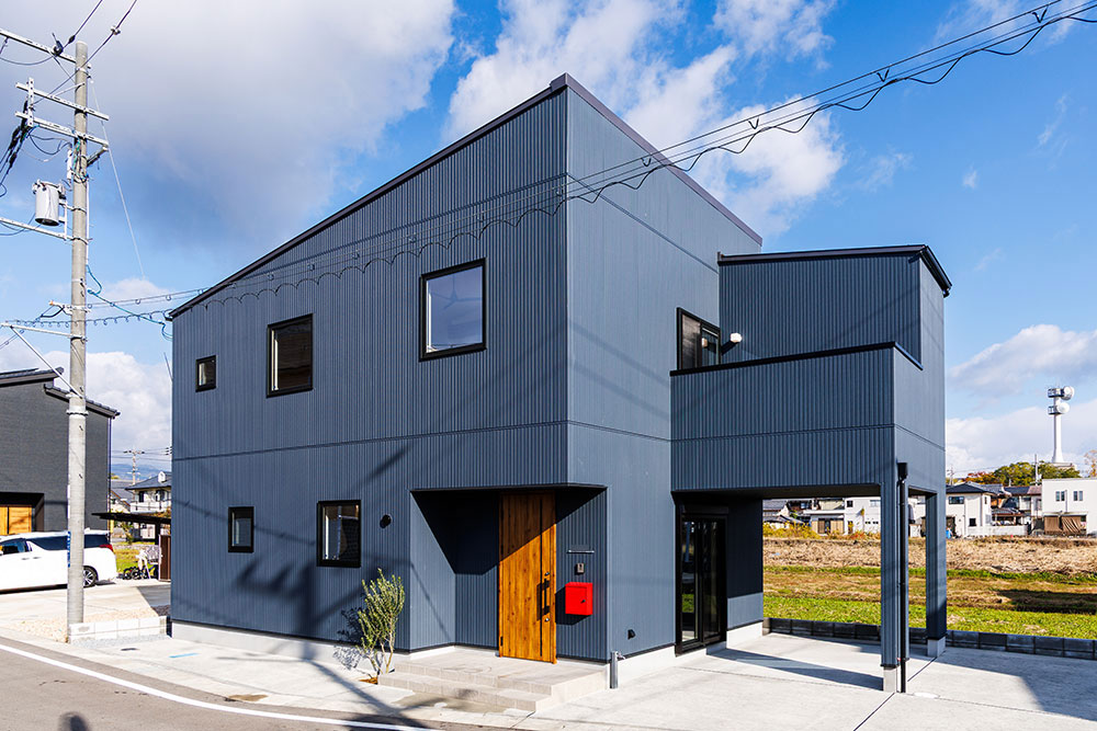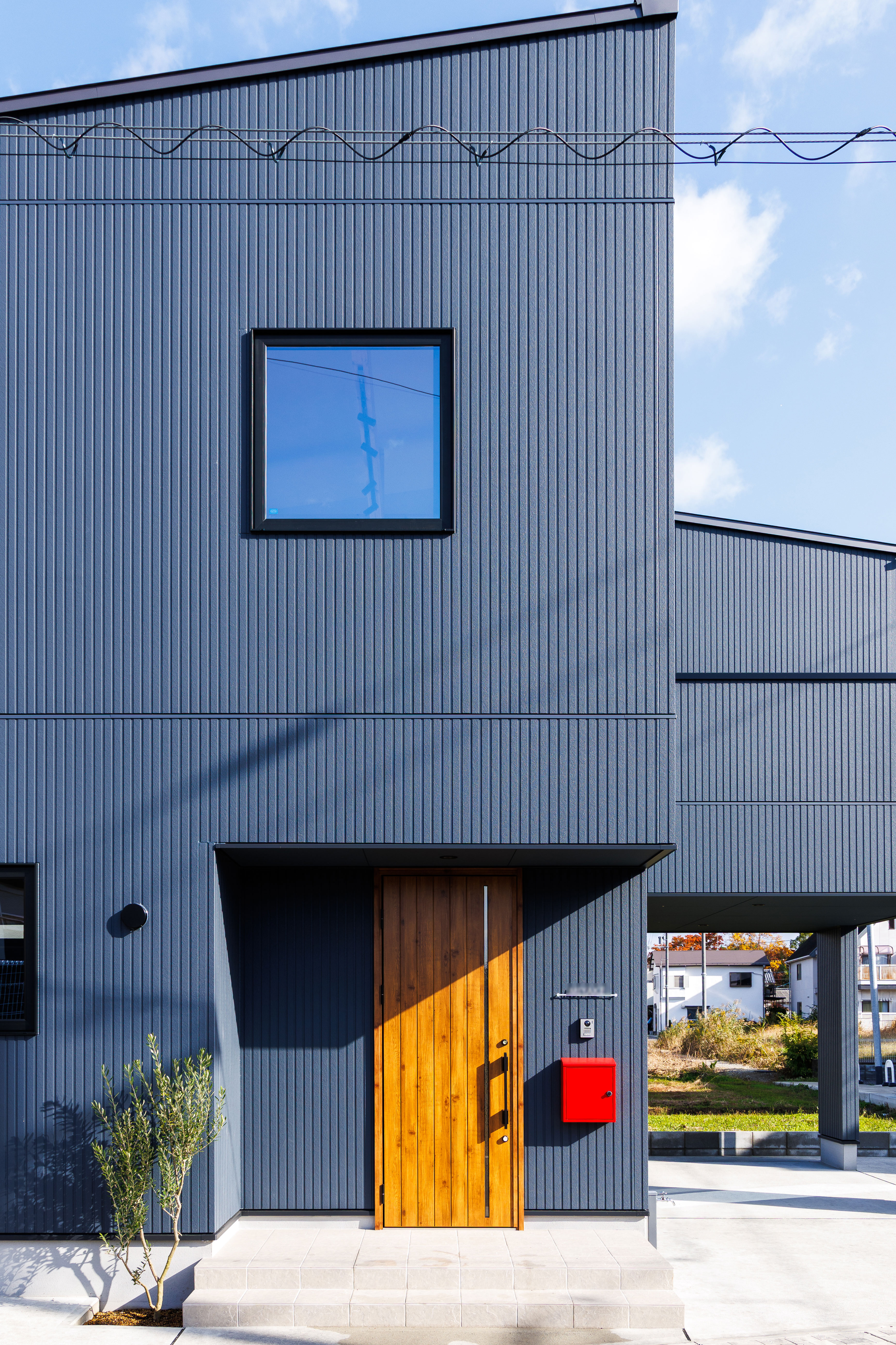 自然光がたっぷりのお家ネイビーの外壁に赤いポストがかわいい外観。バルコニーの下をインナーガレージにしました。