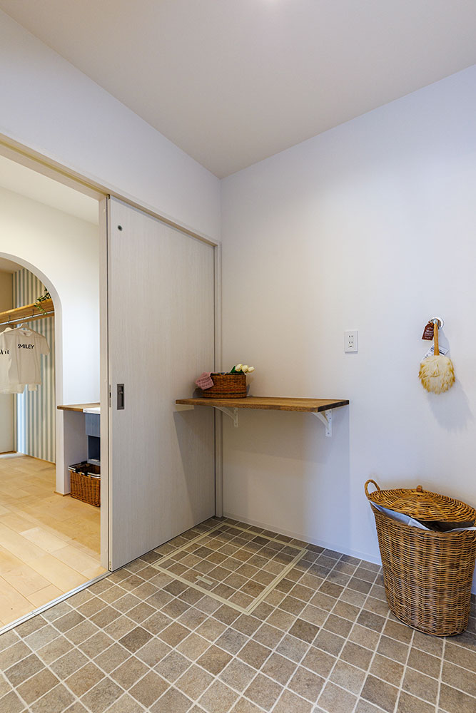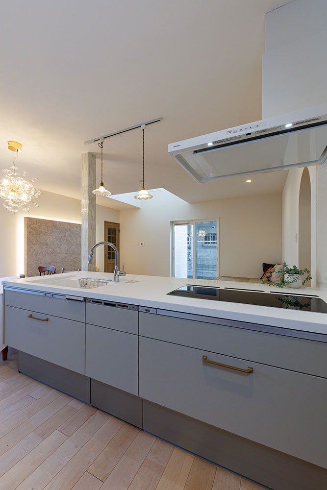 室内に入るとグレージュで統一されたリビング。垂れ壁はすべてアーチに、ニッチまでもアーチにしました。吹抜けから入ってくる柔らかい光がさらにかわいく優しいリビングにしています。テレビを設置するふかし壁は間接照明をデザインし少しラグジュアリーで落ち着いた雰囲気を作ってみました。小上がりのタタミスペースは収納を作りました。